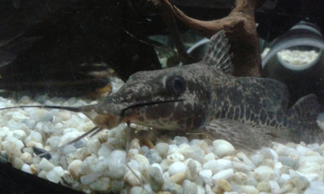 Po Clarotes laticeps bol toto môj druhý tip z afrických sumcov. Ryba má aktuálne asi 12-13 cm. Veľmi sa nehýbe, keď som blízko akvária. Keď sa vzdialim, niečo občas vezme do papule.