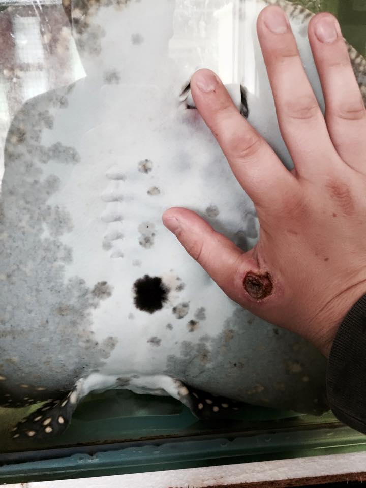 Keď som blízko nej čisitl sklo, pseudoplatystoma sa zlakla a tá vyplašila raju. Ako sa raja otočila a zdrhala šlahla ma po prste chvostom.