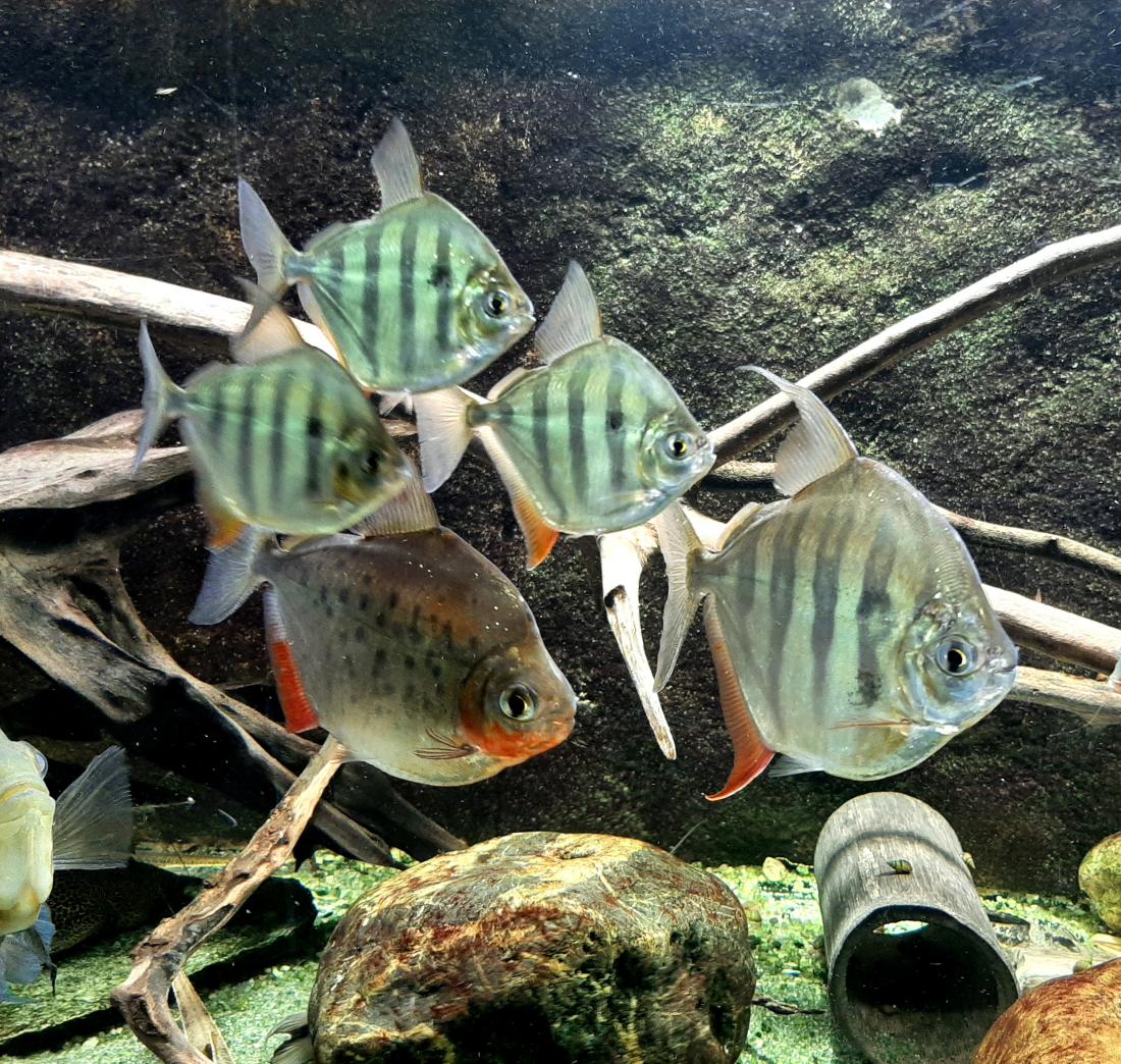 Fotky mladých s dospělou samicí M. fasciatus a v hejnu s Metynnis sp. big spots Peru ......