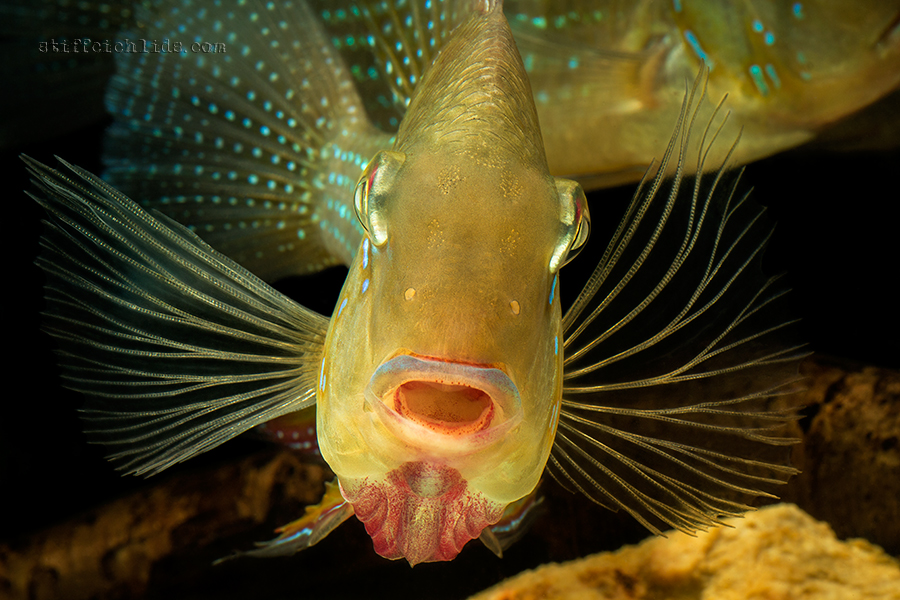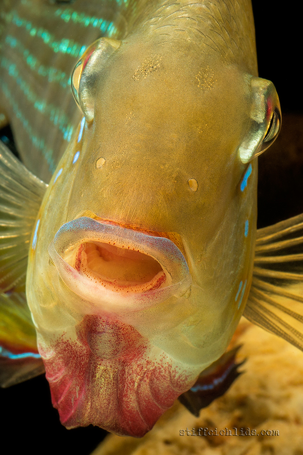Odchov: Ideální je chovat od počátku hejno cca 8 kusů, ve kterém se ryby sami spárují. Chovný pár se vytírá v jeskyních, dutinách (např. květináč). Samička klade v průměru 200 jiker, stará se o jikry i plůdek. Samec střeží okolí hnízda. Plůdek krmte drobnou živou potravou, z počátku naupliemi žábronožky solné. Potěr je velmi citlivý na vyšší obsah dusíkatých látek. Celkově je výtěr ryb i odchov plůdku náročný a je určen zkušených chovatelům.