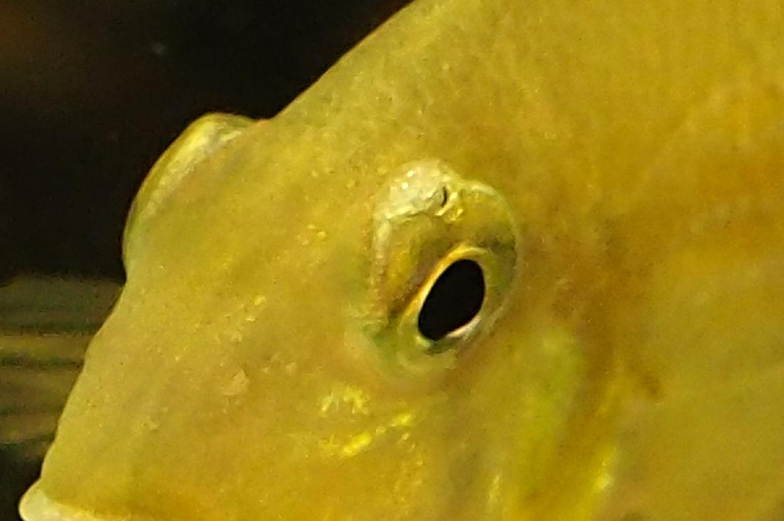 Při večerním krmení jsem na jedné rybce našel podivný útvar nad okem. Je to vidět hlavně při pohledu mírně šikmo shora. Může to být plíseň? Nikdy předtím jsem si toho nevšiml