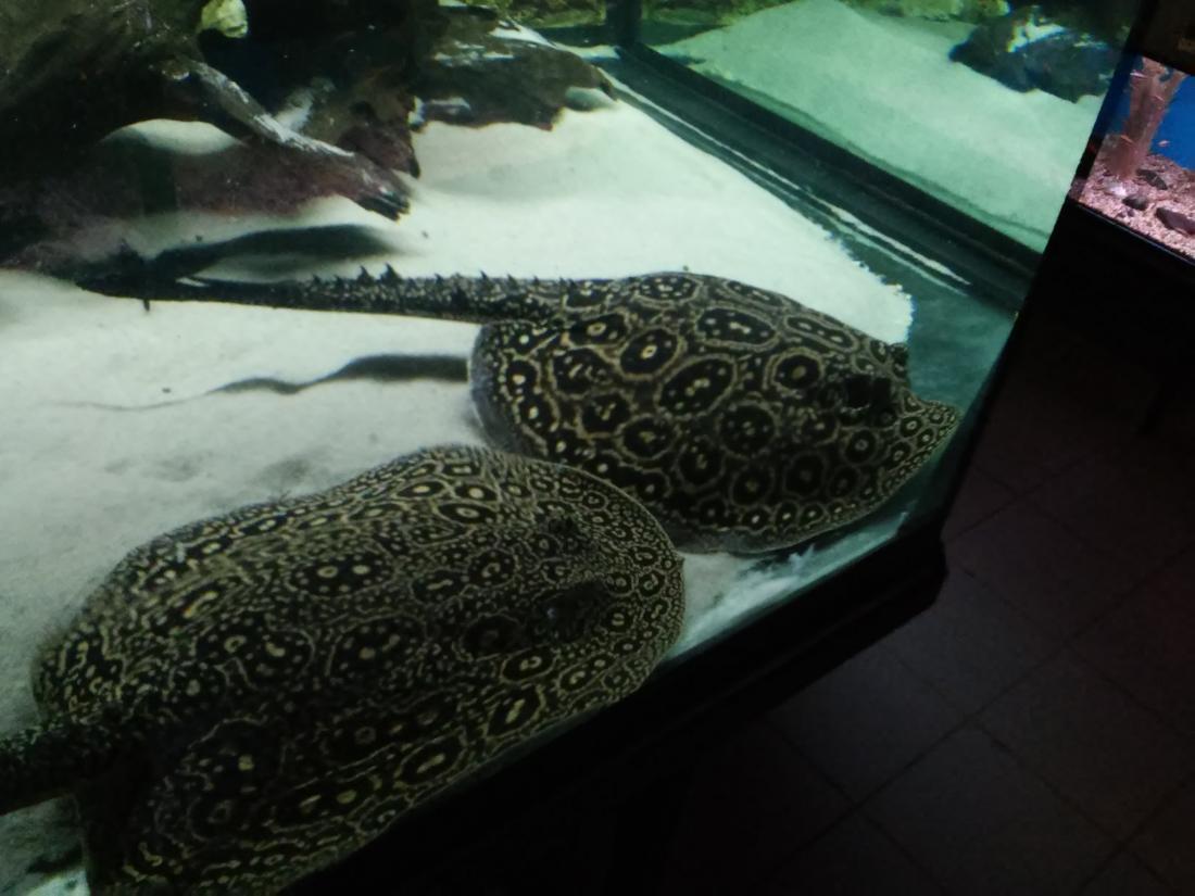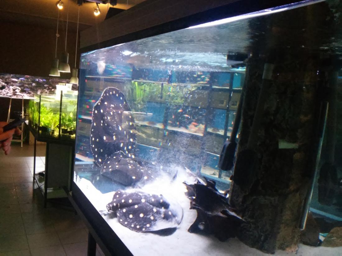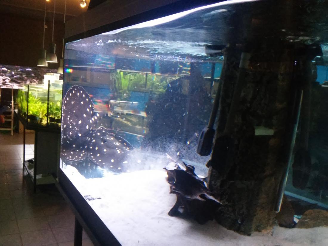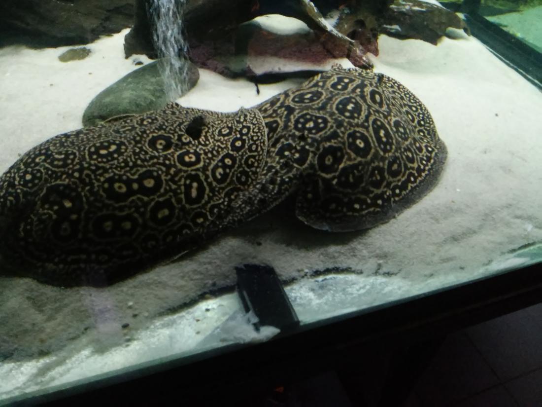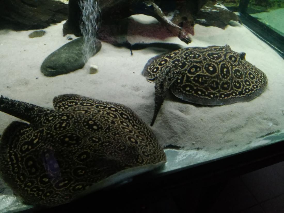 Štítek tam měli jurupari ale já je mezi sebou nerozeznám , bylo to malý stříbrný a měli je v nádrži dohromady s A. heckelii .... Jinak kromě skalárů s pěknejma ploutvema jsem si z klidný JA ničeho snad ani nevšiml , ještě nějaký cichlidky Apisto ale to si fakt nepamatuju jméno . Já slintal nad těma rajema ,cichlama a ocelátem :D . Takový ty pěkný hnědý flekatý trnuchy jsou prý nějaký Potamotrygon sp. pearl a jeden z těch dvou v páru má v sobě albinotickej gen a už se jim několikrát narodili mladý a prý byl v malých podvakrát jeden bílej kus . Jeden umřel jako malej a jeden se dožil dospělosti a jeho cena prý byla 100 000,- ???