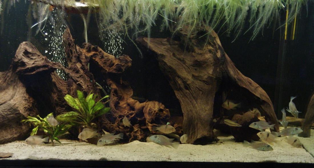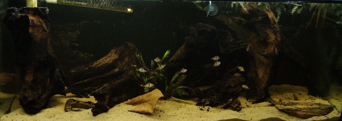 Původně akvárium obývali čichavci a asijští sumci (pakeříčkovec a sumíčci), pak jsem ale dlouhou dobu zanedbával údržbu a ztratil jsem sumíčky a spoustu druhů kvítek. Po obnovení péče o akvárium jsem nádrž předělal pro Jihoamerické ryby. Vystřídal jsem různé druhy ryb: Pterophylum scalare rio Nanay, Geophagus iporangensis, Satanoperca jurupari, Geophagus Red Head, Geophagus sp. Pindare, ... Teď bych chtěl ještě Mesonauta mirificus a Geophagus taeniopareius nebo Satanoperca acuticeps