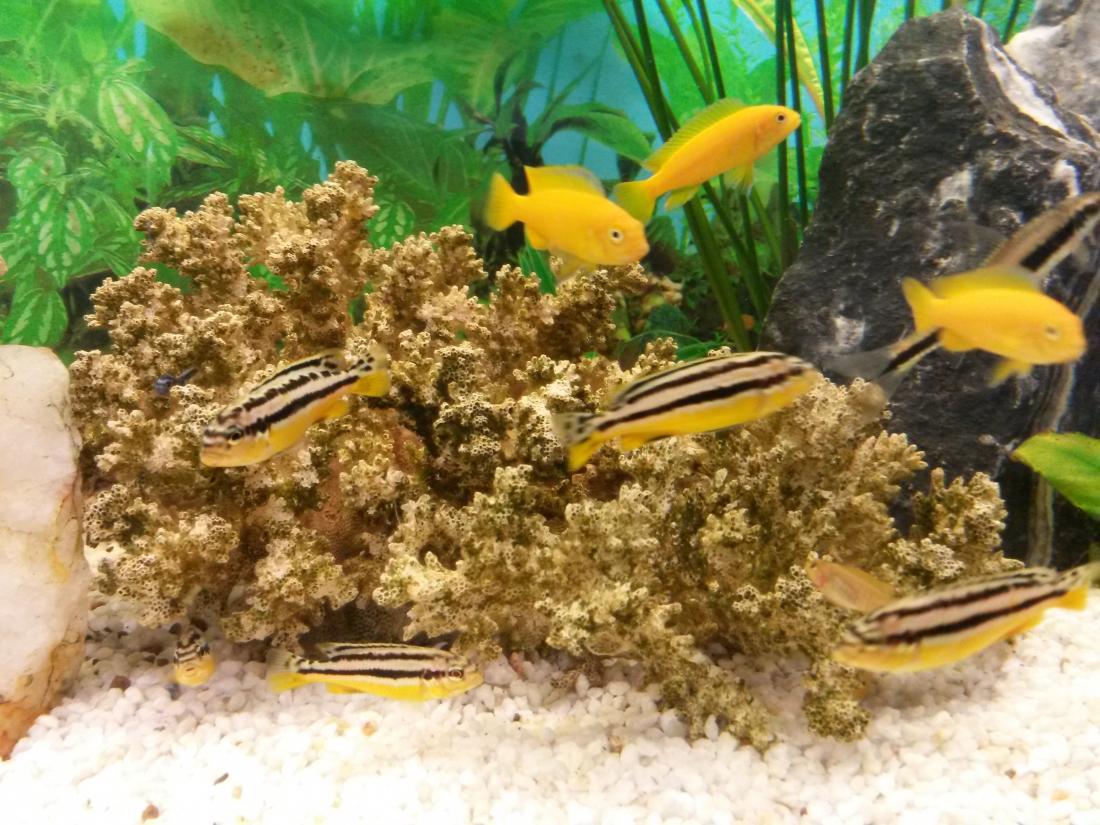 Ryby v nádrži: 2xsamec 4xsamica Pseudotropeus saulosi coral red, Melanochromis interuptus chizumulu,Labidochromis hongi sweden, Melanochromis auratus