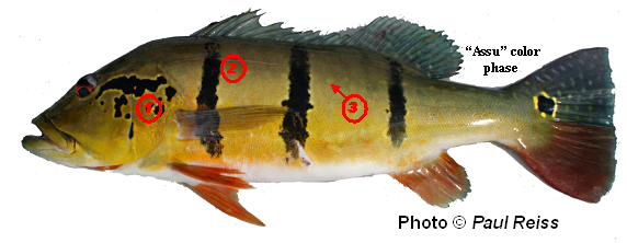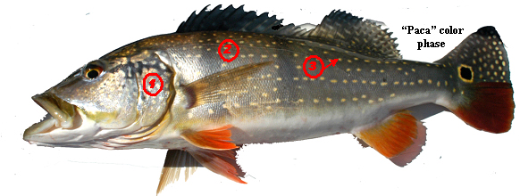 3 odlišné, celé pásy od vrcholu chrbta až pod laterálne čiary, takmer až po brucho. Rozlišovacia postorbitálna skupina (alebo rad prepojených škvŕn na operculum (líce). V Paca forme, štyri vodorovné rady svetlých farebných škvŕn.