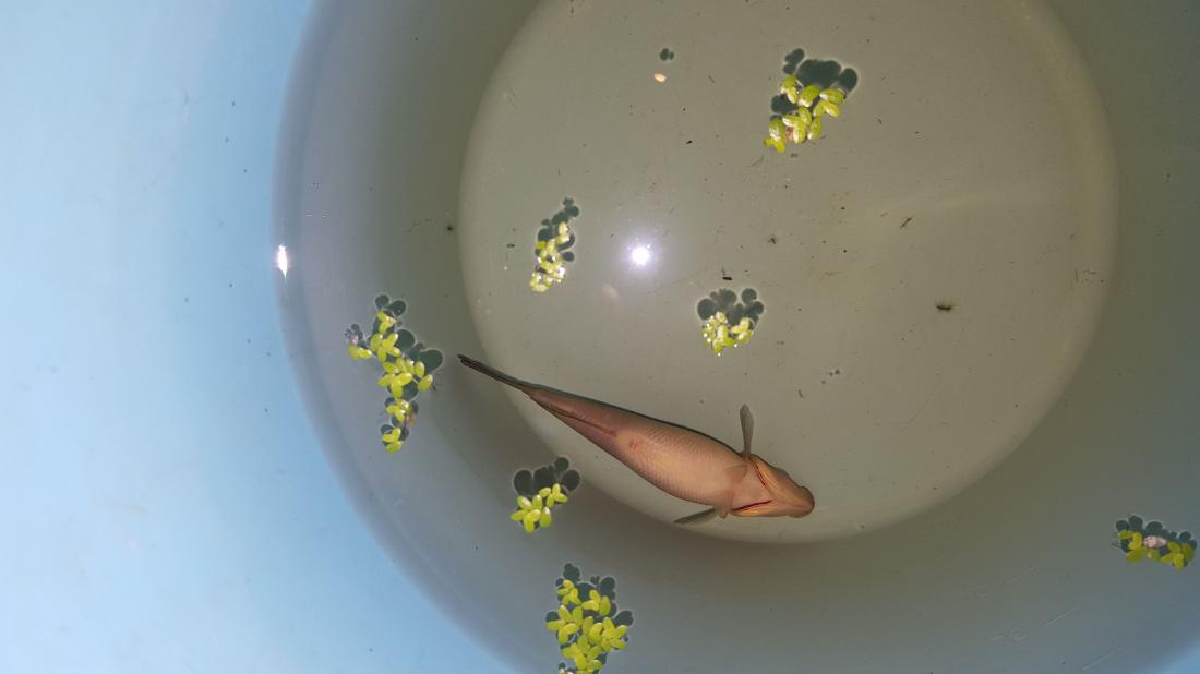 Chování úplně stejné, jen bych řek že už nemá stažené ploutve jak před pár dny. Ale lekavá je stále stejně, ale jinak plave s ostatníma rybama po nádrži. Krmení stále spíš jen uzobkává, než by se na něho vrhala.