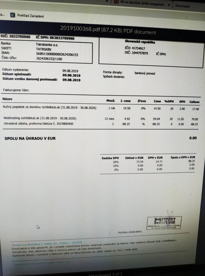 Ahojte. Vyššie som uviedol posledný príspevok ohľadom verejných financií , z ktorého vyplýva že niekde na mojich účtoch by sa mal potulovať zostatok 93,10 EUR. Ale už tam nie je, nakoľko bola vykonaná úhrada za registráciu domény a webhostig na obdobie 31.8.2019 - 31.8. 2020 v celkovej cene 88,25 EUR, takže rok máme ešte čas na doplnenie financií a nášho zostatku 4,85 EUR