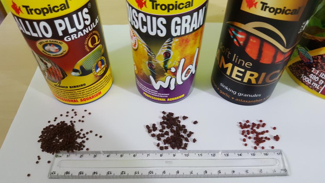 Objednal jsem nějaké nové krmení od Tropicalu ať mám něco na vyzkoušení. Na fotce je srovnání velikostí granulek. Tropical Soft Line America jsem vzal střední velikost, prodává se ještě menší a větší. Všechny tři druhy moc neplavou a rovnou klesaj ke dnu. Pár postřehů: