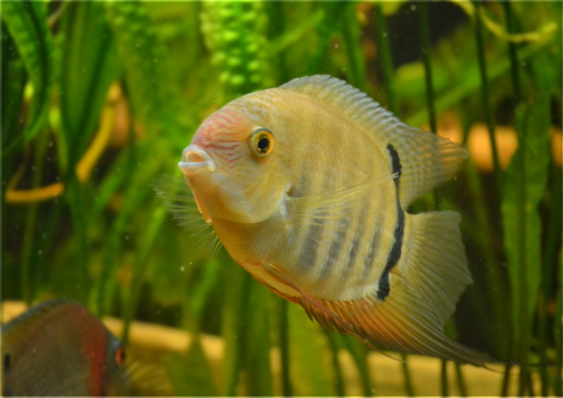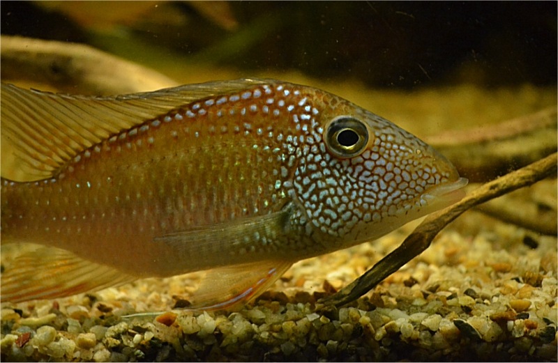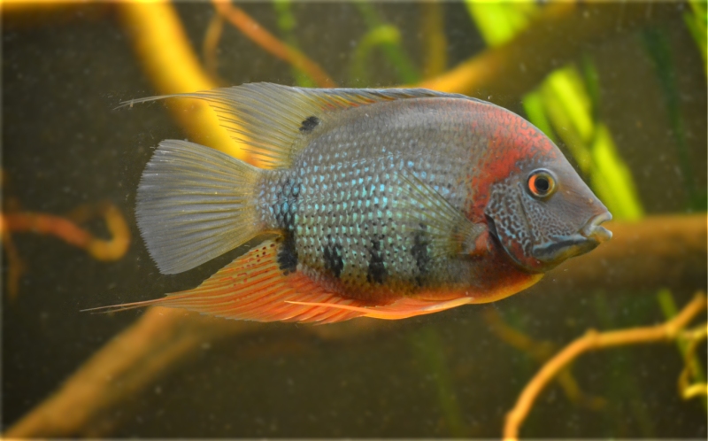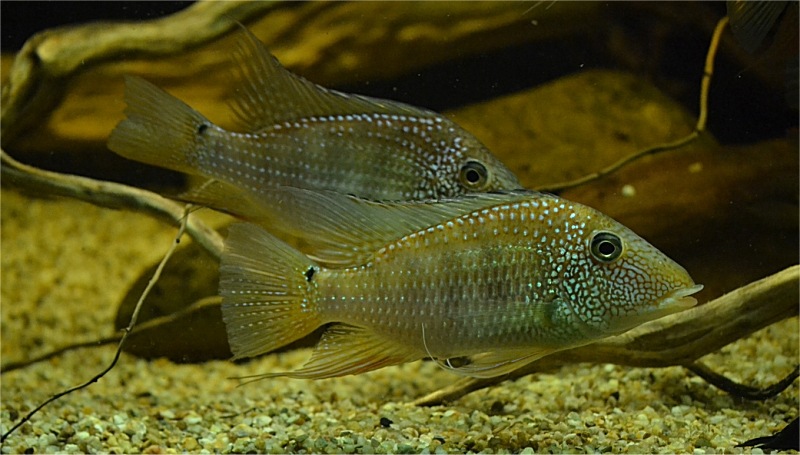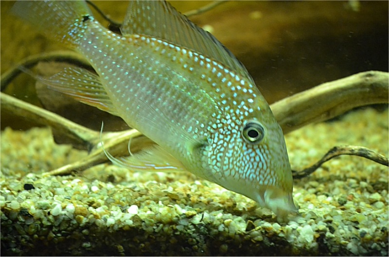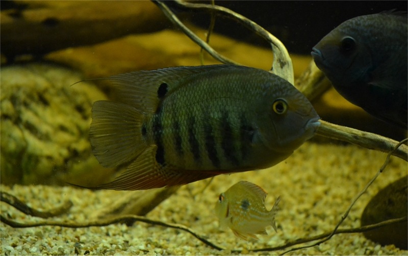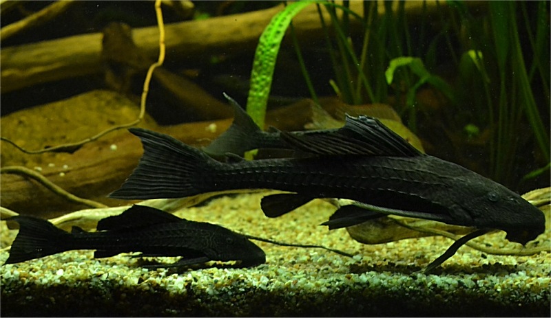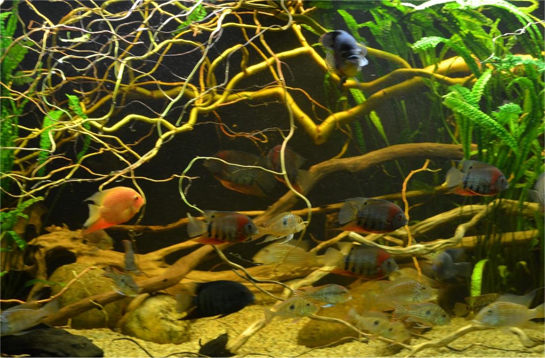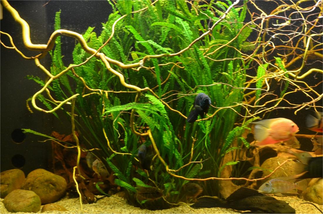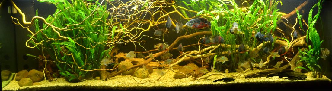 Dekorácia v nádrži: čierne pozadie, kremičitý štrk 2-3 mm, mangrove, krútená vŕba, naplavené drevo, okrúhliaky