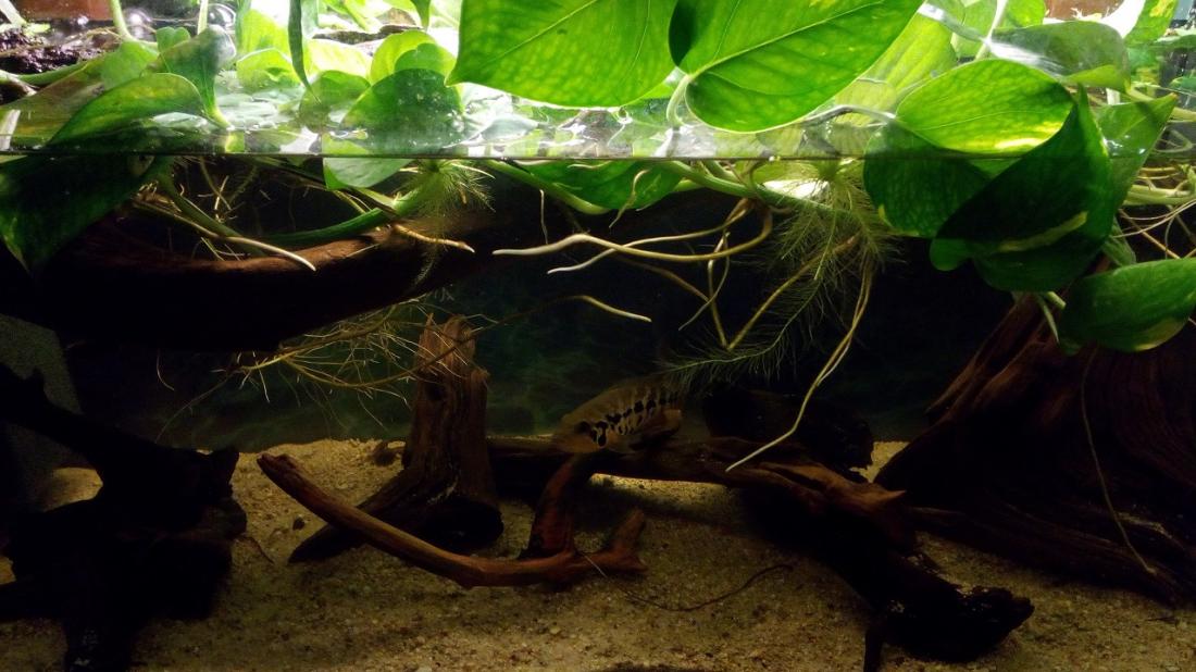 Přidávám ještě snímeček z běžné údržby odchovny. Na všechny ostatní reaguje sameček útokem při přiblížení k akvárku na metr, zatímco já se mu tam můžu vrtat jak chci a on je v absolutní pohodě (mám ho od čudly, je to tak stále). Samička taky. Z jejich strany je to neuvěřitelná důvěra a z mé klika jako trám :D