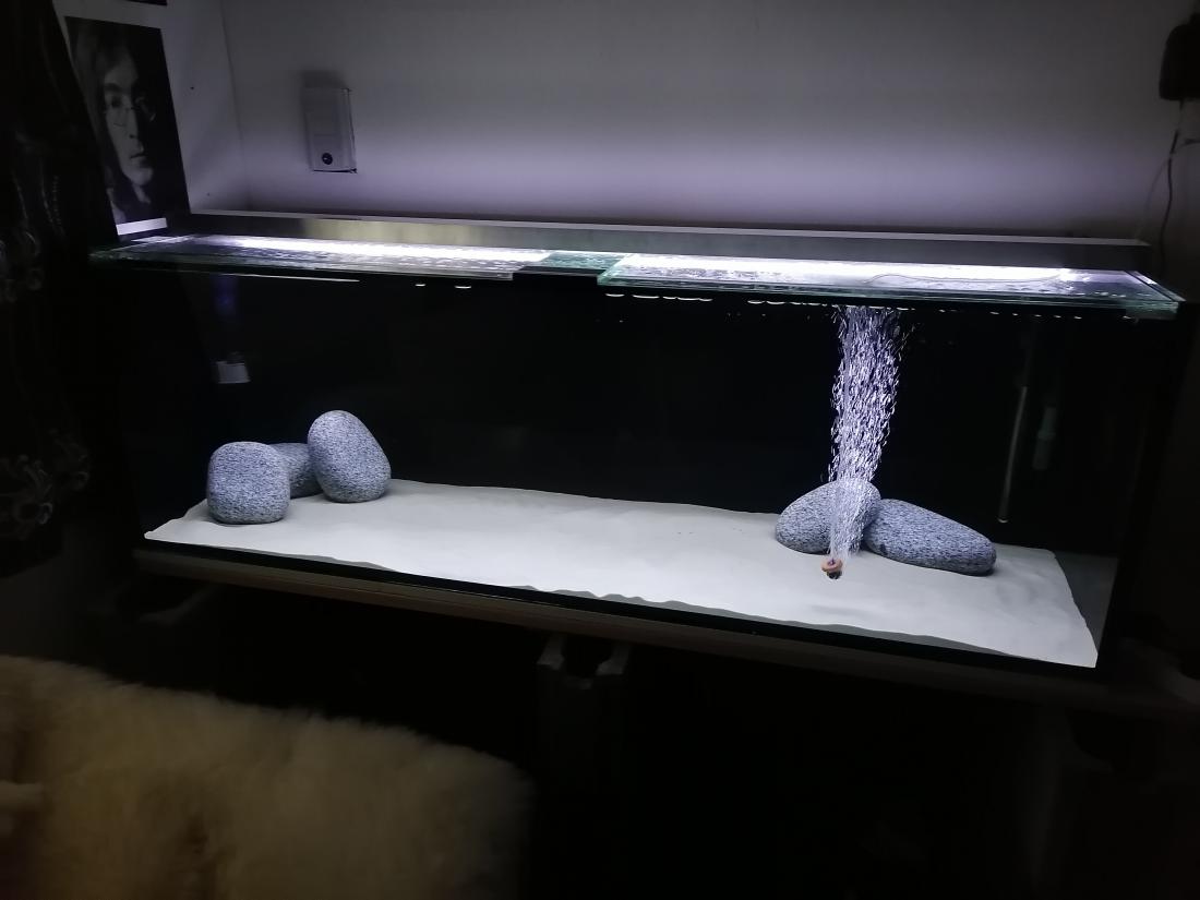 Dekorácia v nádrži: Dno jemný písek. Kameny granit