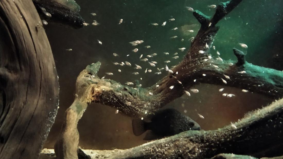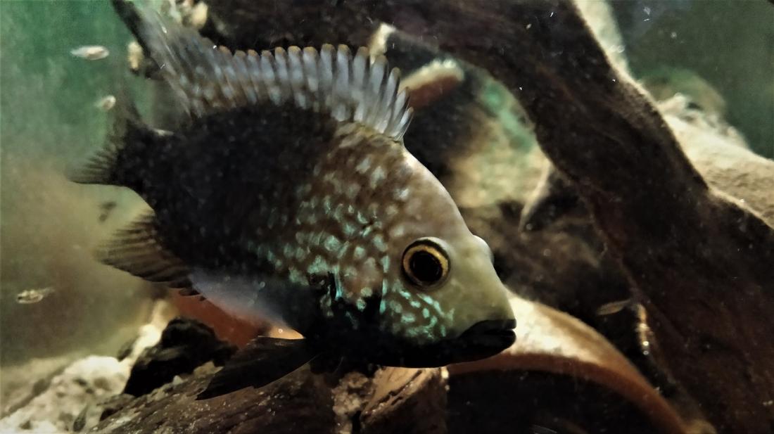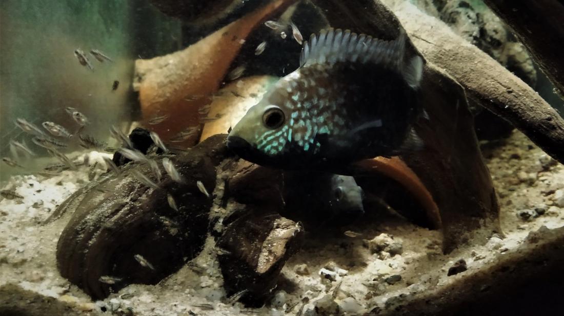 Každopádně nečekaný brzký výtěr mohl být zapříčiněný i prudkou změnou v životních podmínkách k lepšímu. Tyhle rybky vyrůstaly na granulích, v relativně prázdné nádrži ve společnosti velkého počtu sourozenců. U mě mají akvárium jen pro sebe, vybavené přímo pro jejich potřeby silnou vrstvou jemného (tmavého) písku na hrabání, velkým centrálním pařezem, množstvím kořenů a dalších úkrytů. Krmeny jsou pestrým výběrem živé potravy, většinový podíl tvoří, tak jako v přirozeném prostředí rostliny, řasy a sinice (vygoogleno na ichtyologických, roz. vědeckých webech). Ty spásají prakticky nepřetržitě, na poslední zmíněné, když jsem jim ten svinčík začal podávat, se dost dlouho vrhali s náruživostí žraloků cítících krev