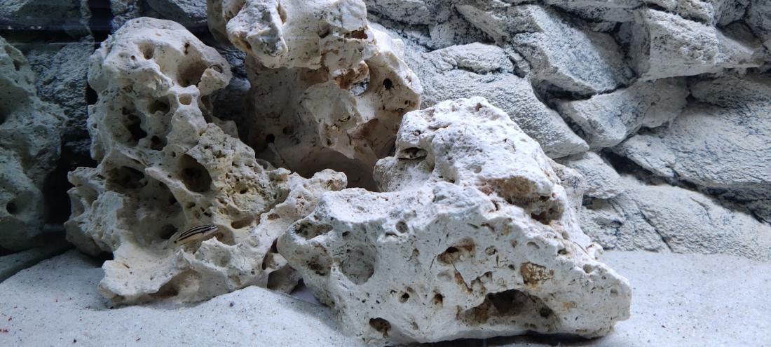 Julidochromis ornatus 5 ks - bolo 6, jeden padol, vyzerá že jeden pár sa už vytvoril a ak sa na druhom útese vytvorí druhý pár tak ostanú 4.. alebo možno len ten vytvorený pár