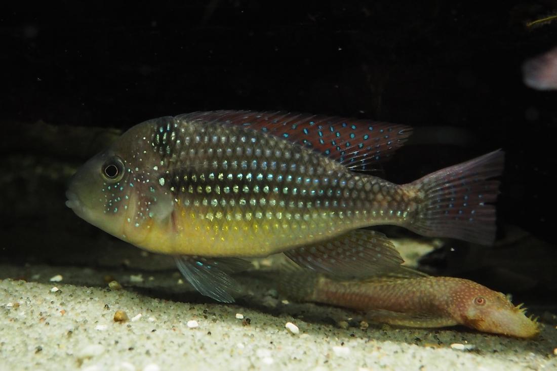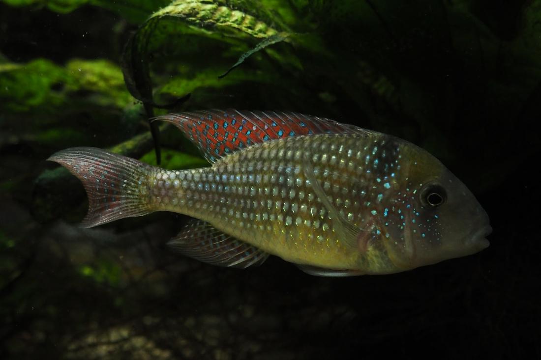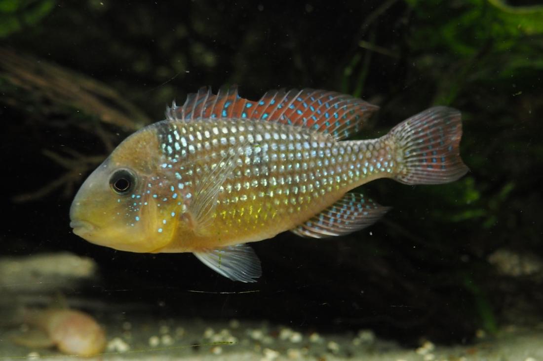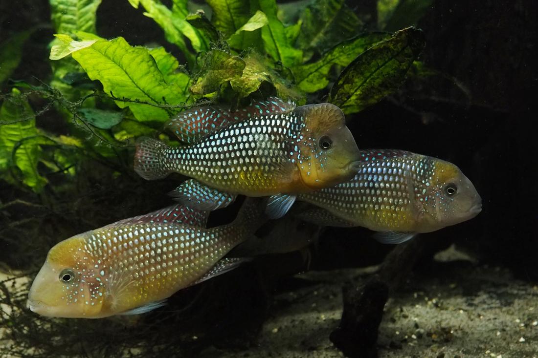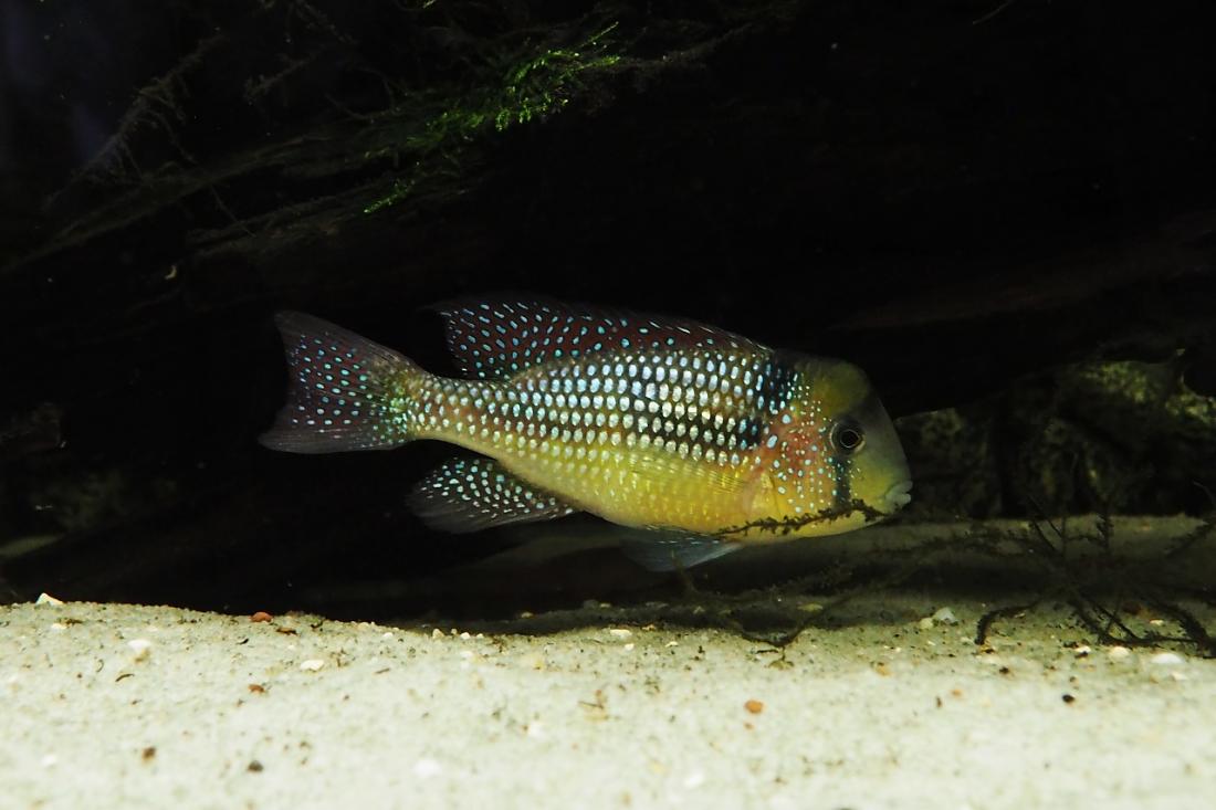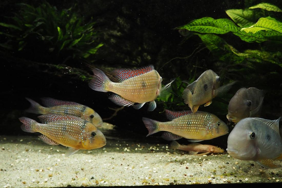 Samci mají odhadem kolem 15ti cm. Nejsilnějsí si zabral skoro celou nádrž a odhání ostatní i od krmení. Obě samičky jsou většinu času v jeho části pod kořenem. Poslední dobou samce dost odhánějí, tak tam možná něco mají. Mám objednanou plastovou mřížku do úlu, kterou chci akvárium rozdělit.
