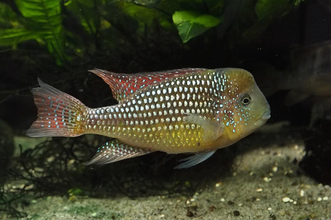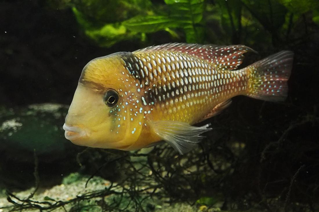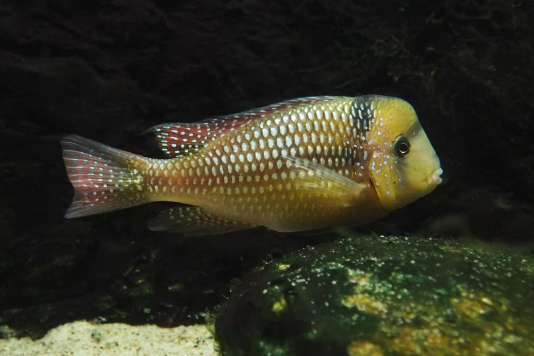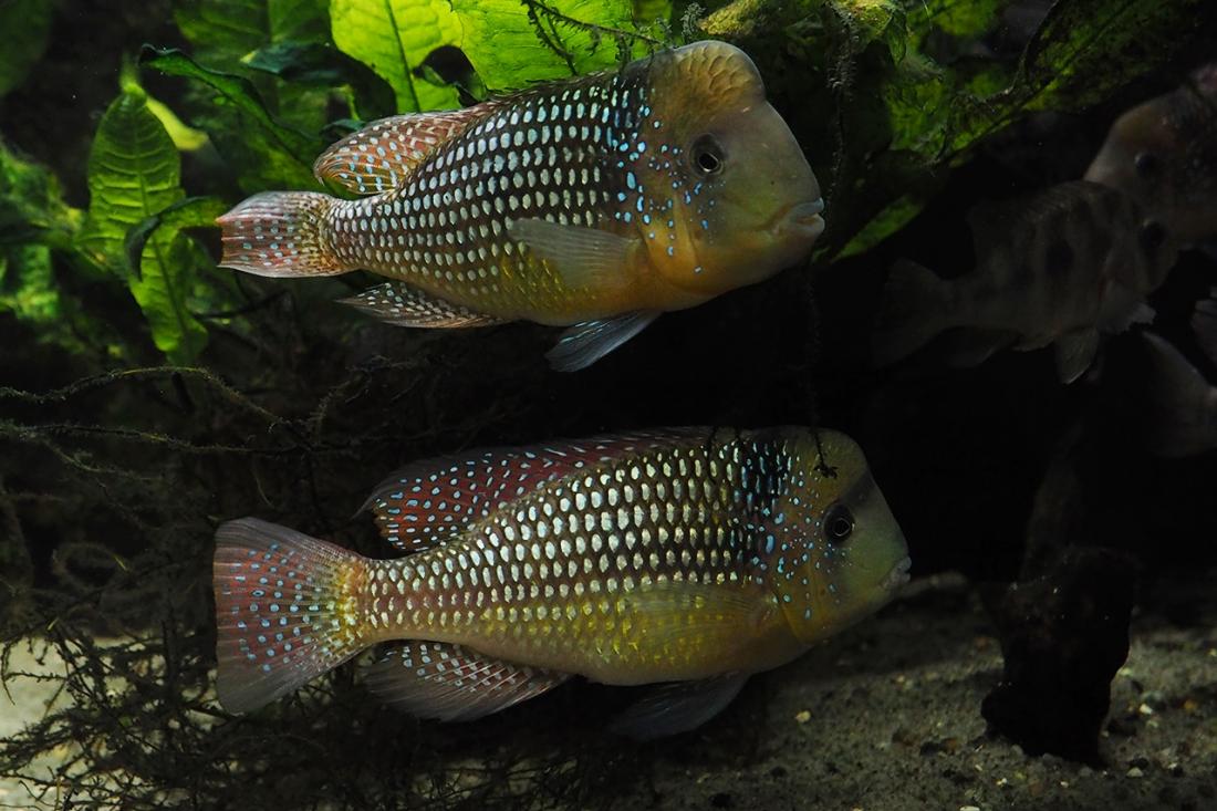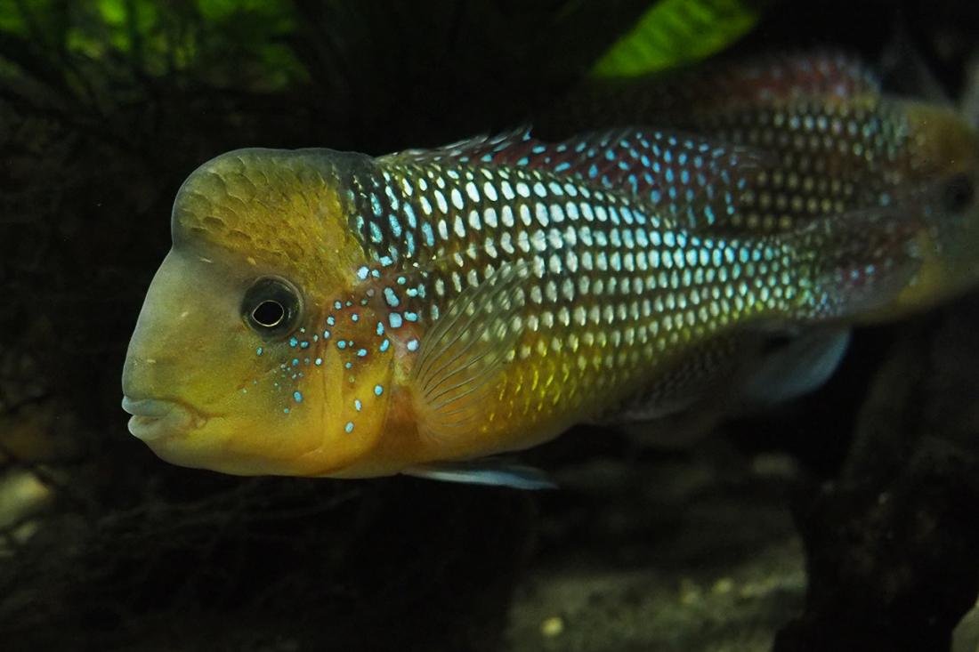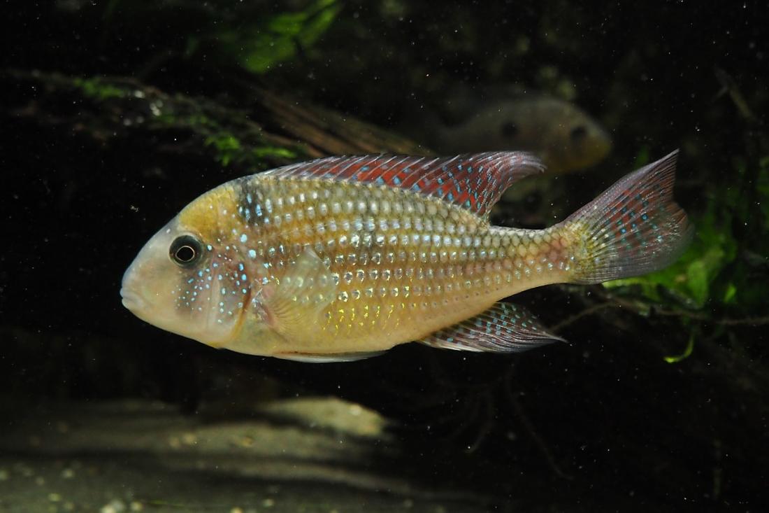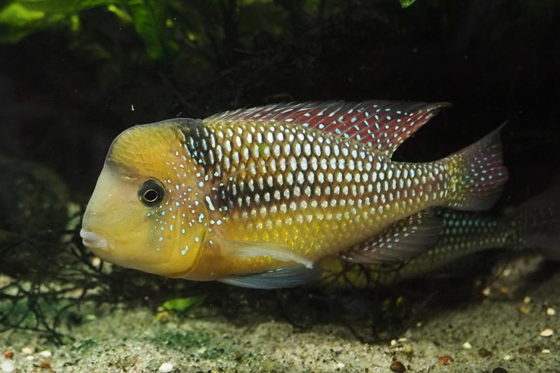 Samci mají odhadem kolem 15ti cm. Nejsilnějsí si zabral skoro celou nádrž a odhání ostatní i od krmení. Obě samičky jsou většinu času v jeho části pod kořenem. Poslední dobou samce dost odhánějí, tak tam možná něco mají. Mám objednanou plastovou mřížku do úlu, kterou chci akvárium rozdělit.