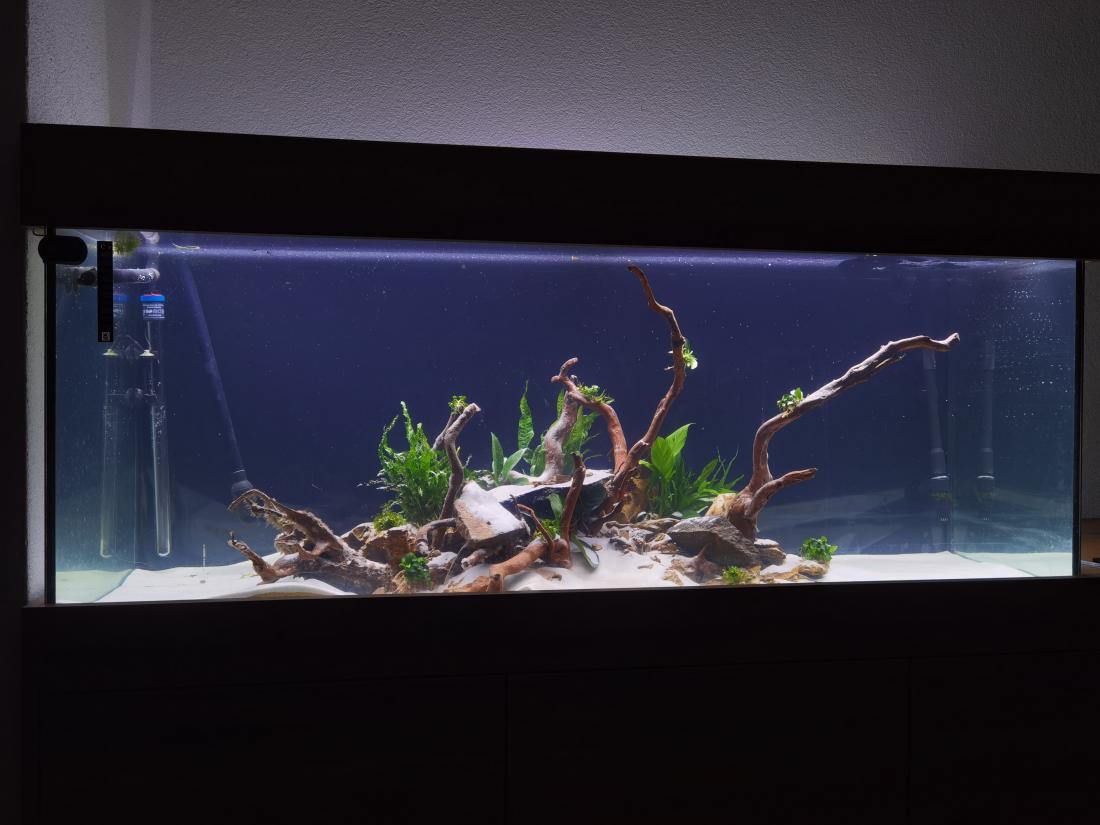 budúci týždeň ešte pribudnú rastlinky, asi len anubiasy, a musím ešte dokúpiť kamene. Korene ešte plávajú tak som ich zaťažil nejakými co som nazbieral po záhrade tie pôjdu preč. Inak kamene použité na hardscape sú dragon stone a korene finger wood. Taktiež kryt akvária nebude plastový ale budú krycie sklá nejaké to RGB svetlo a okraj bude z dreva ako to mam na dvoch veľkých akváriách.