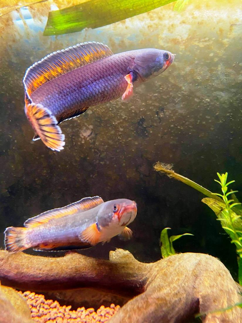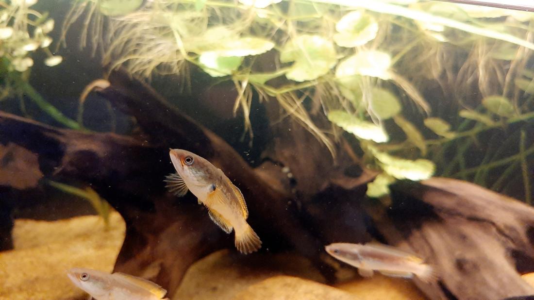 Mladé rybky ke mě přijeli jako ještě nevybarvené 3cm hadičky, teď už to chytá nějaké barvy, které se pomalu blíží k rodičům.