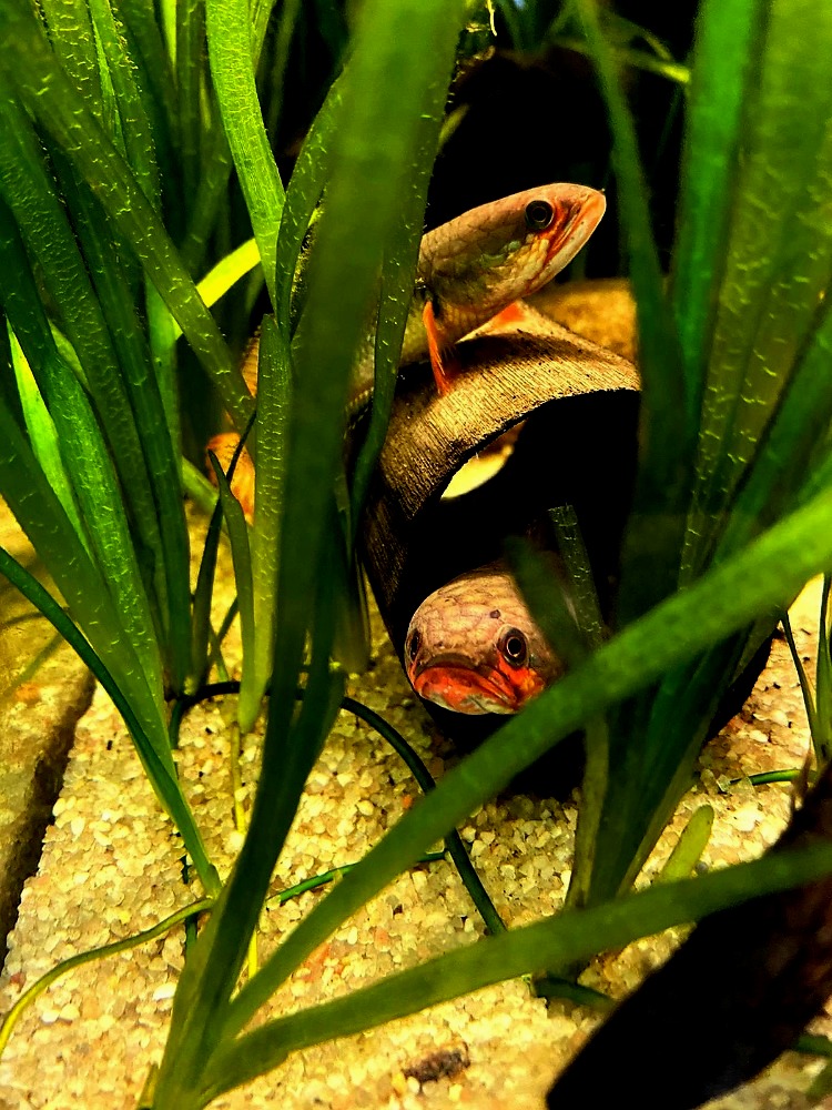 Mladé rybky ke mě přijeli jako ještě nevybarvené 3cm hadičky, teď už to chytá nějaké barvy, které se pomalu blíží k rodičům.