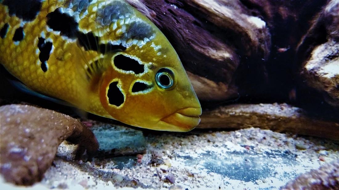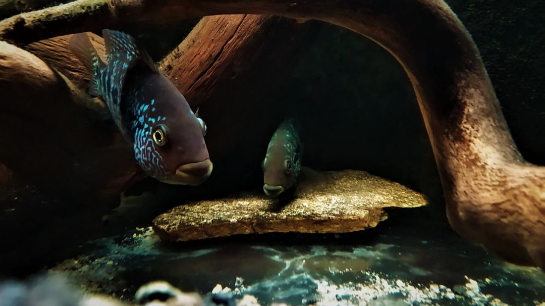 Tady mám ze společenského akvárka (dohromady je tam šest ryb) dvě poloviční sestry - mají společného tátu. Klasicky zbarvená má něco přes tři roky a měří 21 cm, ta s metalickými znaky je roční, aktuálně asi 14 cm dlouhá. K ségře jsem ji přidal když byla přibližně poloviční, od počátku spolu vychází bezvadně.