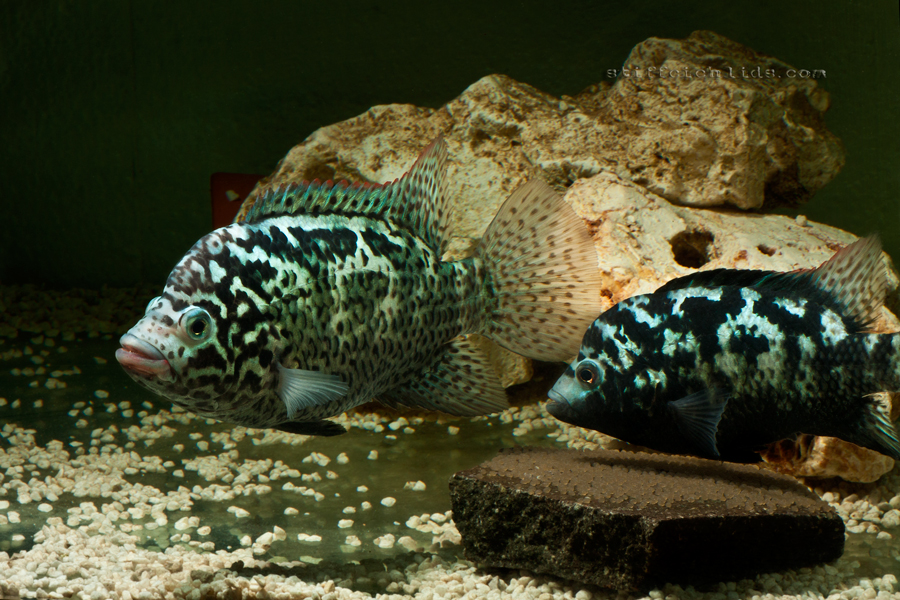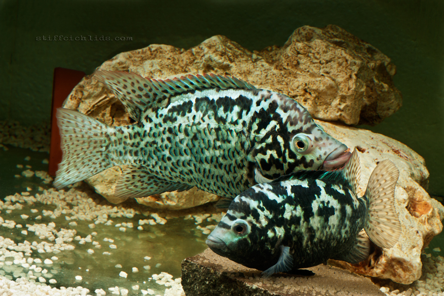 Rozpoznanie pohlavia je pomerne jednoduché. Samce sú výrazne väčšie ako samice, majú strmšie čelo, ktoré v niektorých prípadoch pripomína tukový hrb. Údaje o veľkosti sa líšia. Najčastejšie udávaná veľkosť dospelého samca v akváriu je cca 25cm. Podľa niektorých zdrojov môže v dobrých podmienkach dosahovať 30cm. Samice sú zvyčajne asi o tretinu menšie. Samce sú na pohľad svetlejšie ako samice a čierne škvrny sú výraznejšie na tvári, inde na tele sú menej výrazné, akoby zanikali. U samíc sú čierne škvrny oveľa väčšie a pokrývajú celé telo, v určitých obdobiach (napr. pri trení) má samica čiernu celú spodnú časť tela.