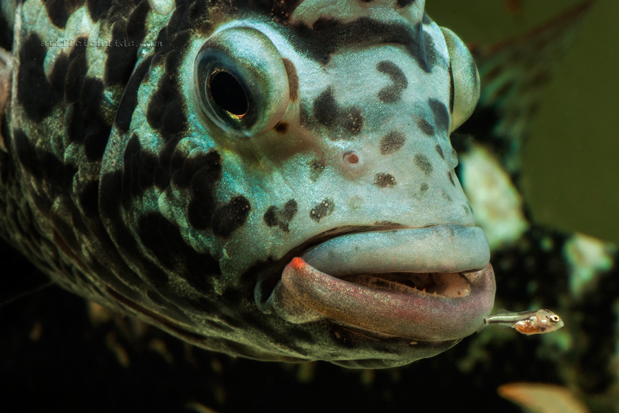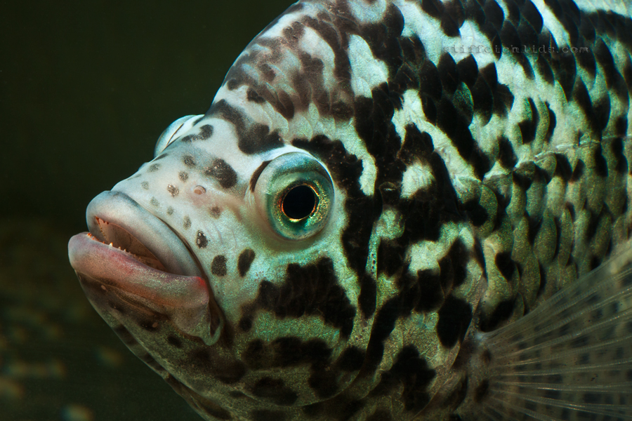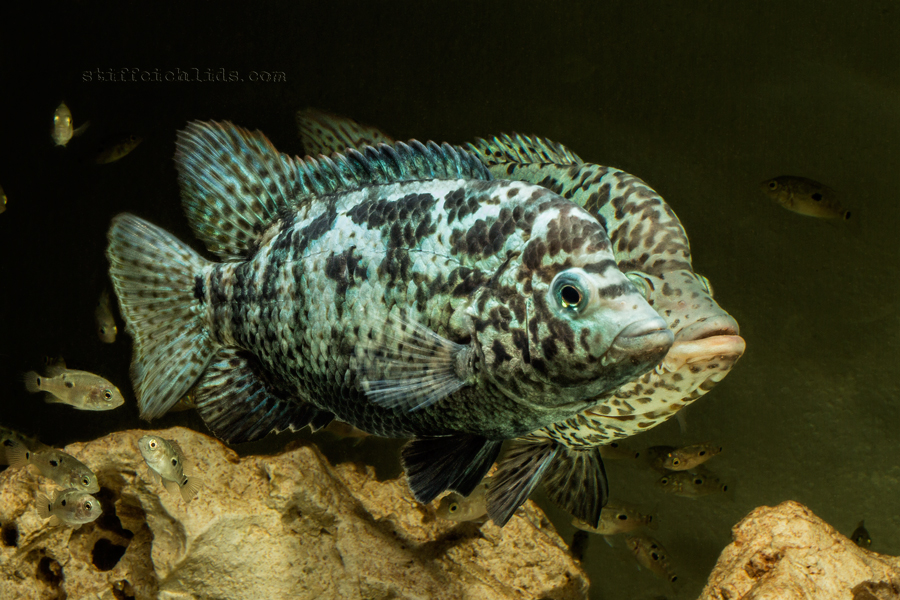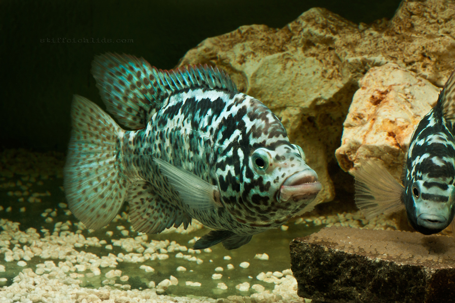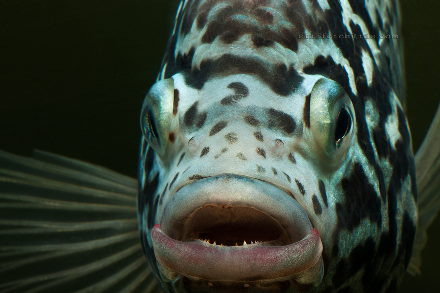 Na prvý pohľad čiernobiele ryby. Podkladová farba tela je svetlá, v niektorých prípadoch až biela, u samcov sa od určitého veku objavuje taký kovový, zelenomodrastý, niekedy až fialový nádych, ktorý s pribúdajúcim vekom naberá na intenzite. Po tele aj na plutvách je množstvo tmavosivých až čiernych škvŕn, ktoré sú tmavšie a intenzívnejšie u samíc. Na vrchu chrbtovej plutvy je červený lém, výraznejší u samcov. Niektoré internetové zdroje podľa veľkosti a množstva čiernych škvŕn na tvári rozlišujú dva farebné varianty. Ryby sa vyfarbujú podľa nálady. Niekedy sú svetlé s čiernymi škvrnami, inokedy sú celé tmavé, hlavne u samíc často stmavne celá spodná polovica tela. Sfarbenie sa mení aj v závislosti od veľkosti a veku rýb. U samcov som v niektorých prípadoch pozoroval červenkasté zafarbenie pier.
