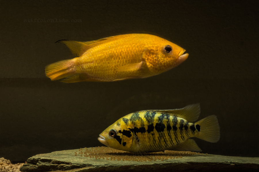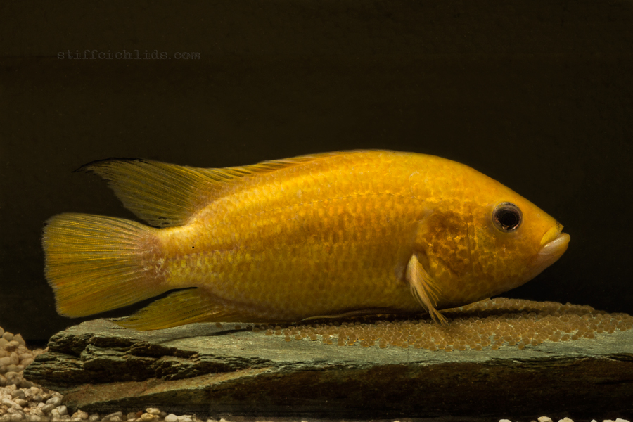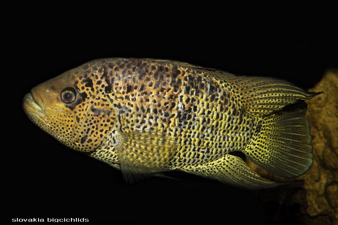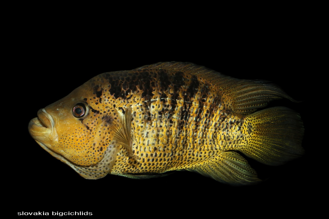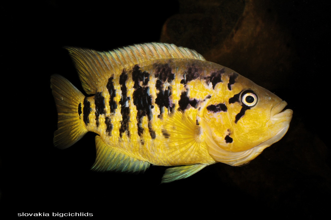 Občas sa objaví aj čisto žltý jedinec. Mne sa to párkrát stalo. Je to niečo podobné, ako pri Rocio octofasciata - Electric blue jack dempsey. Farebná anomália, síce pekná(?), iná, modrá.., ale geneticky nestabilná. Do 5-7cm žiadna zmena (v tomto je rozdiel oproti EBJD, ten je iný už od začiatku