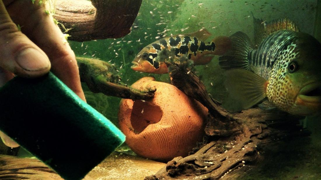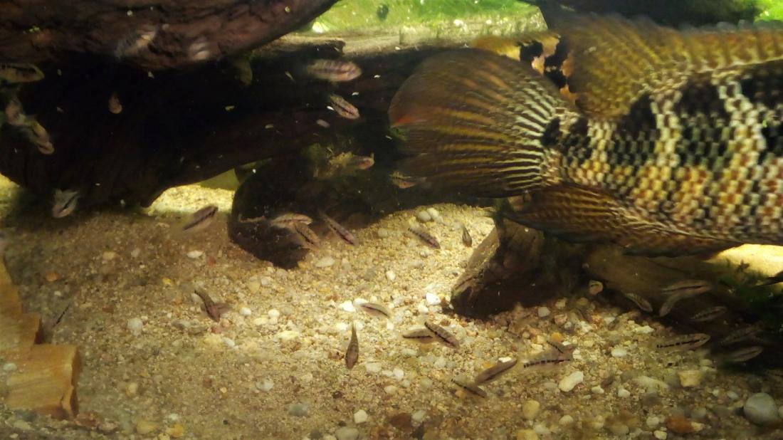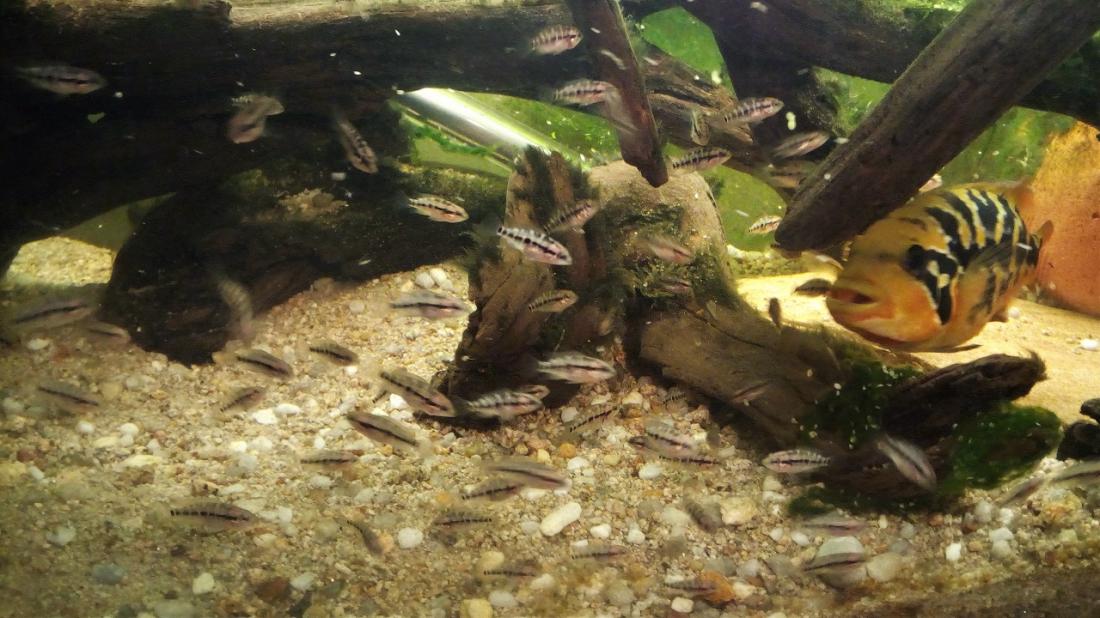 Jediná horečná aktivita nastává okolo tření (i když u mého páru už taky ne, kvartýr k Papulčině spokojenosti předělal Potvůrka už loni tak kvalitně, že jsou úpravy před každým dalším výtěrem jen ekvivalent použití prachovky... no a výtěry jsou u harmonického zkušeného páru rutina - večer lehce zintenzivní barvičky a ráno je šutr posetý jikrami). Pak hlídání čerstvě rozplavaných mláďat maminkou, aby např nevlezla do filtru... Tři čtyři dny a už zas postává vedle manžela, poučení prckové si plavou jak se jim zlíbí