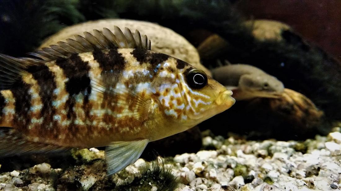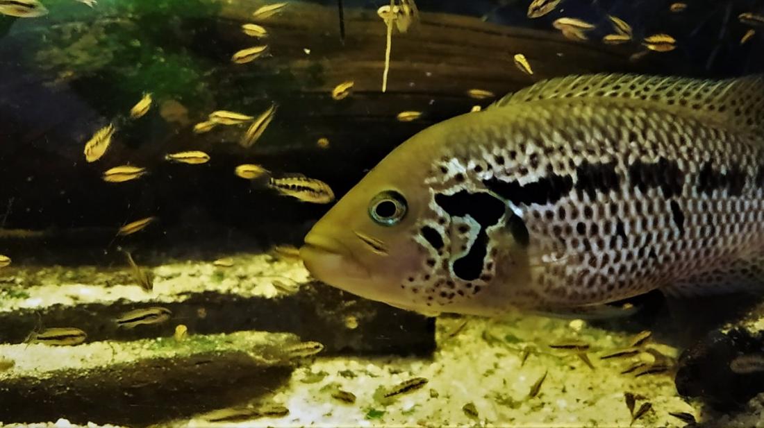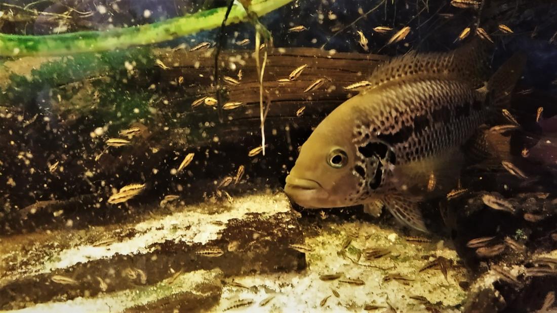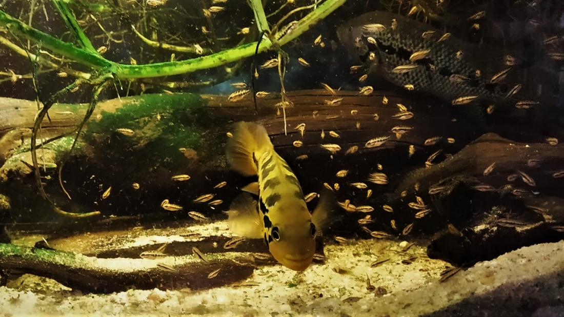 On je pětiletý, měří 33,5 cm (zaokrouhleno, přesně na milimetr jsem míru nechytil), ona tříletá s délkou 18 cm. Ostatní páry jsou z jejich prvorozených potomků a v Německu dokoupených nepříbuzných. Tam jsou zatím rozměry partnerů podobné, barevně ale už teď obrovský rozdíl - dvě holky jsou žlutočerné jako vosy, další s výraznějším podílem červené (po mámě), dva kluci prozměnu tyrkysoví a třetí je lehce do zrzava
