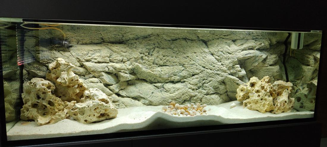Dekorácia v nádrži: pozadie Back to nature Malawi, útesy zo skál sansibar, jemný piesok