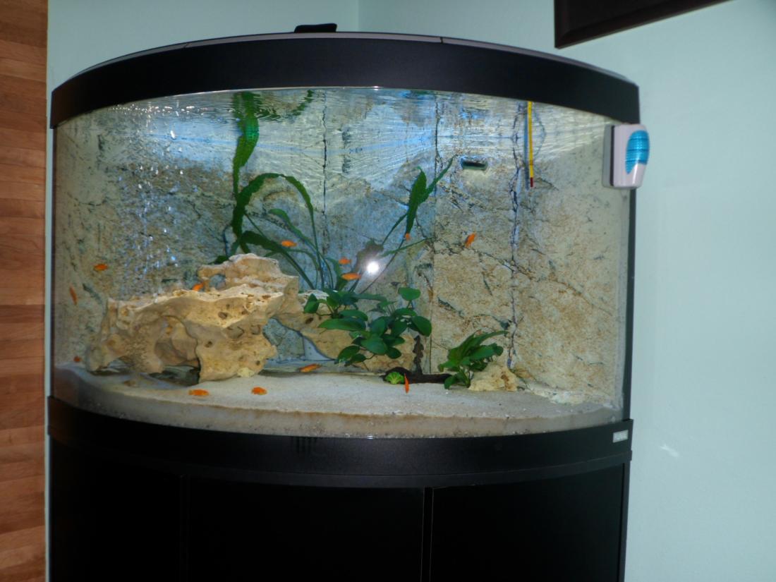 Dekorácia v nádrži: pozadie : Back to nature Slim line ,kremičitý 0,8 , koral.útes Macenauer , kúsok dreva pre prísavníky