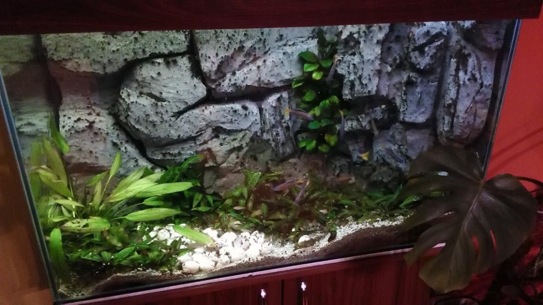 Pribudli k nim dve neolamprologus daffodil - ujal som sa ich z nudze. Bohuzial s nimi prisiel aj prisavnik a na neho mam tazkeee srdce. Pozral vsetku zelenu riasu hajzel! Sice teraz vidiet moje krasne profesionalne domarobene pozadie :D:D:D ale tu ciernu riasu ci co to je zrat nechce a nevyzera najlepsie. Ale zvykol som si. Ked sa mi ho podari chytit, pojde do ineho akvarka (pripravujem dalsie po zruseni stareho v kancelarii (asi na to pouzijem Rostrov predfilter... :lol:), ked ho spojazdnim tak ho sem pridam.