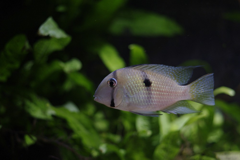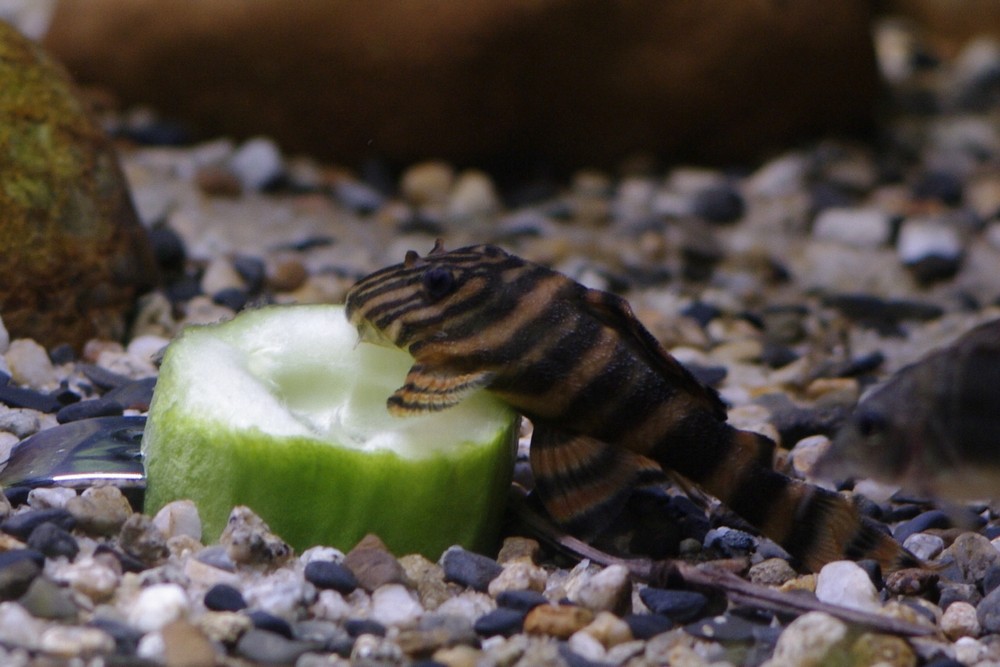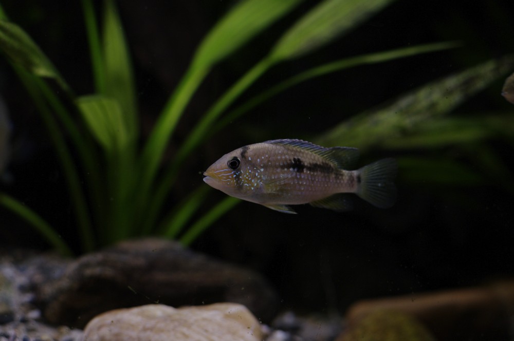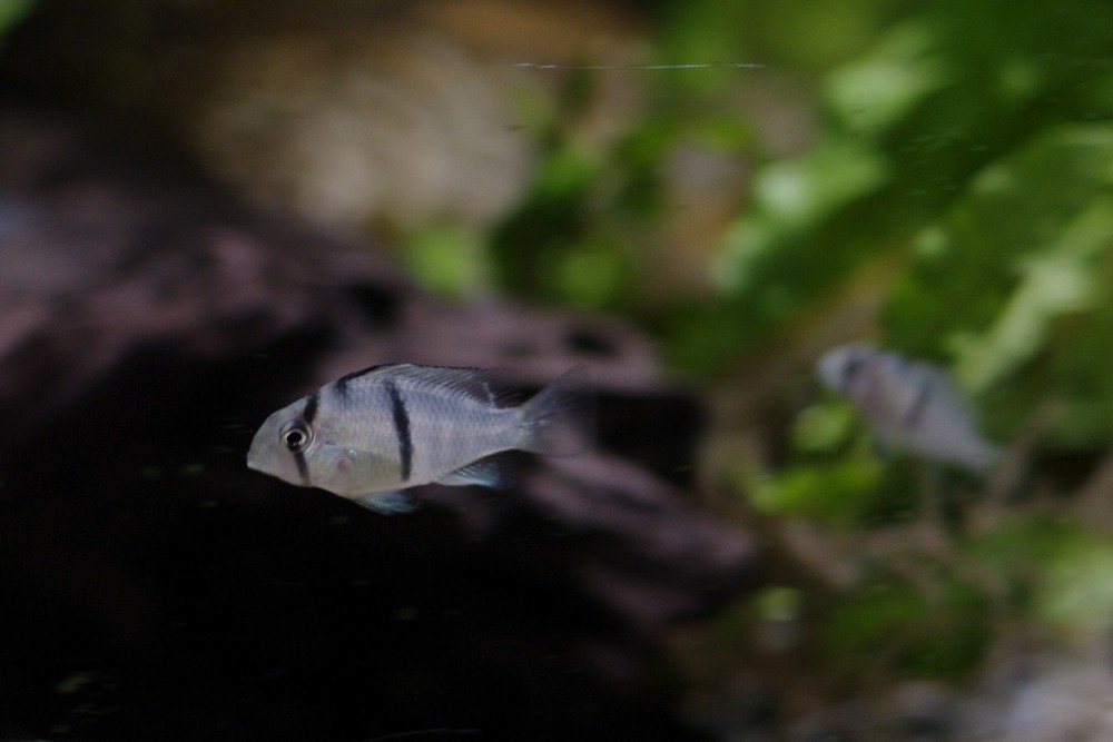 Akary pallidus se skoro nedají fotit. Když se přiblížím k akváriu, tak se přesunou k hladině a žebrají o jídlo. Jednou puknou - nenažranci. Na fotce je pokus o vyfocení největšího kousku (cca 6cm).