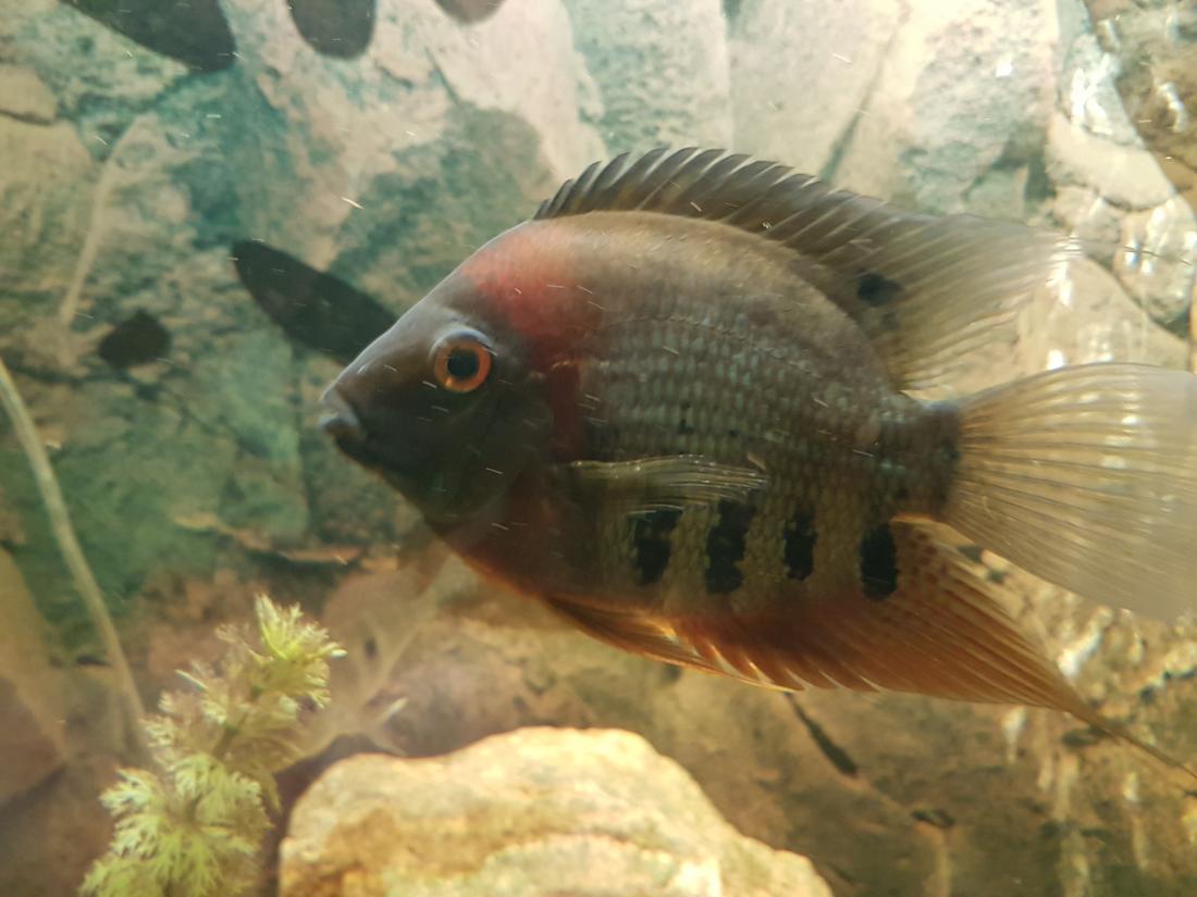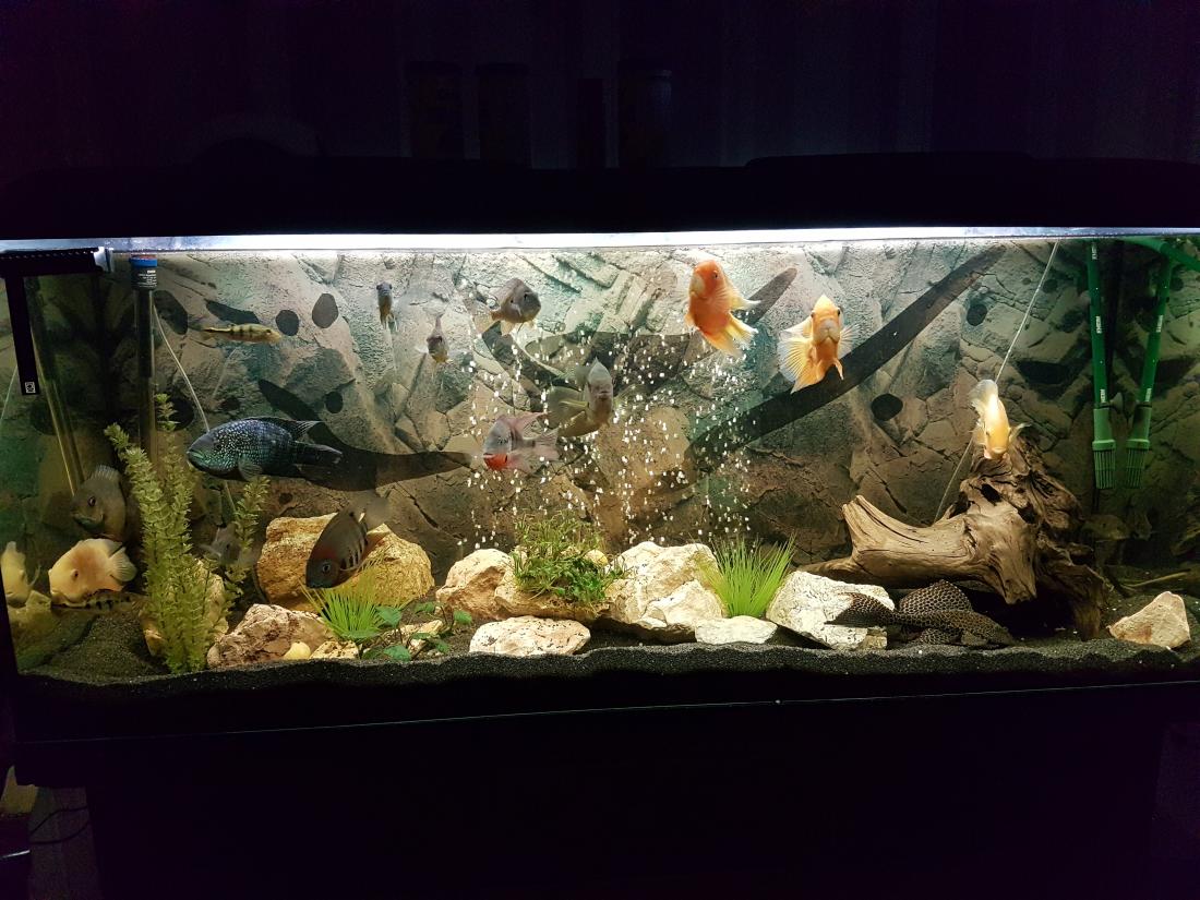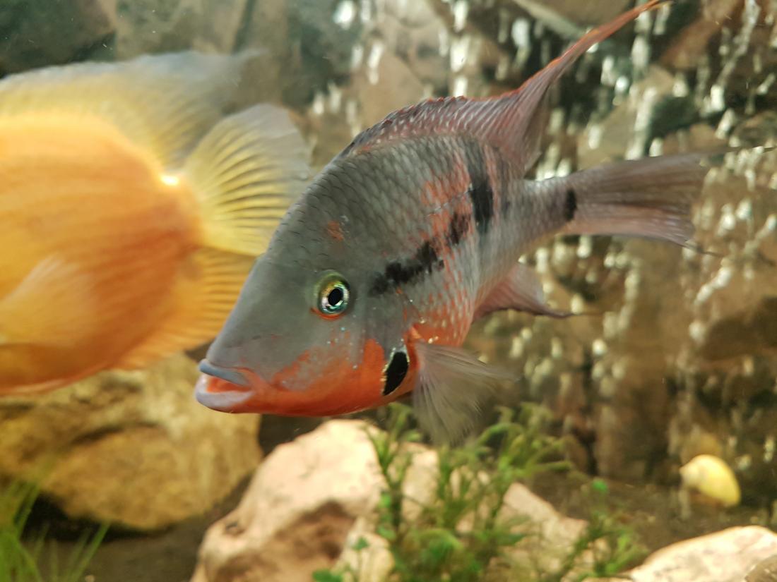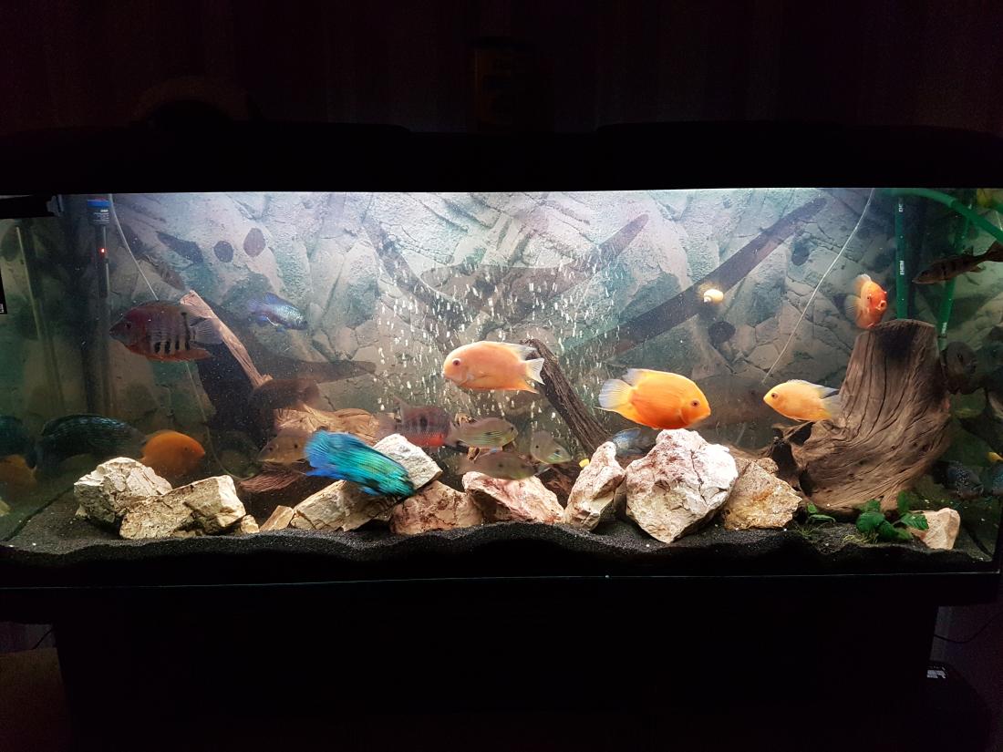 Ryby v nádrži: 1x Rocio octofasciata, 1x Thorychthis meeki, 2x Heros notatus, 2x Heros severum gold, 1x Heros sp. rotkeil, 2x Heros severum red spotted, 5x Geophagus altifrons, 2x Platydoras costatus, 1x Pterygoplichthys gibbiceps, 1x L177