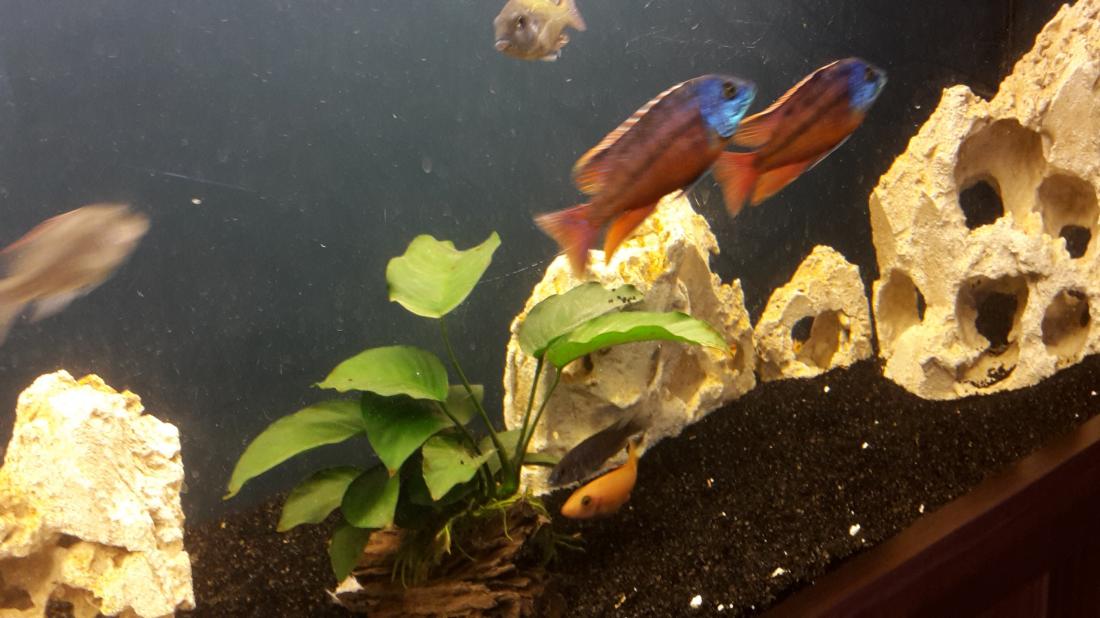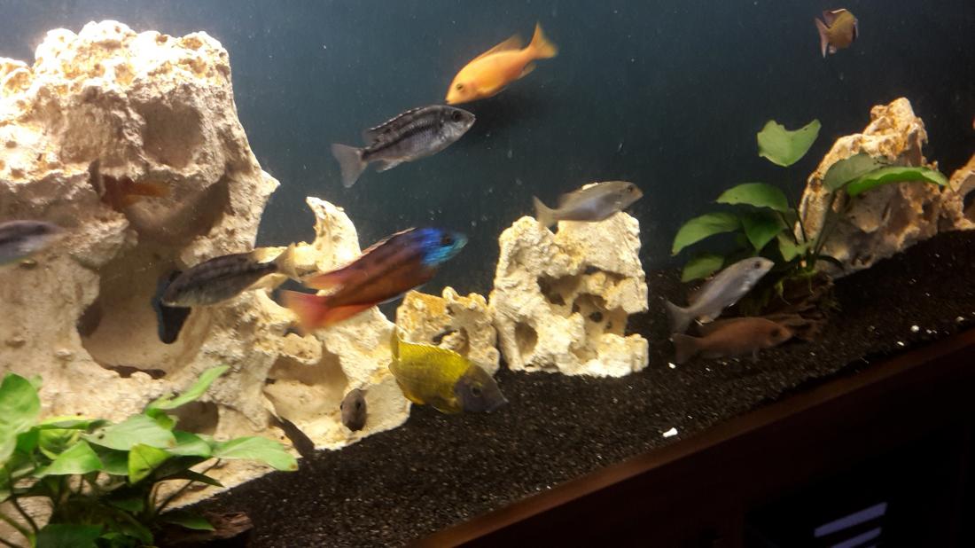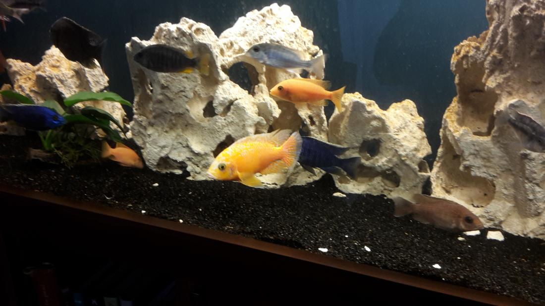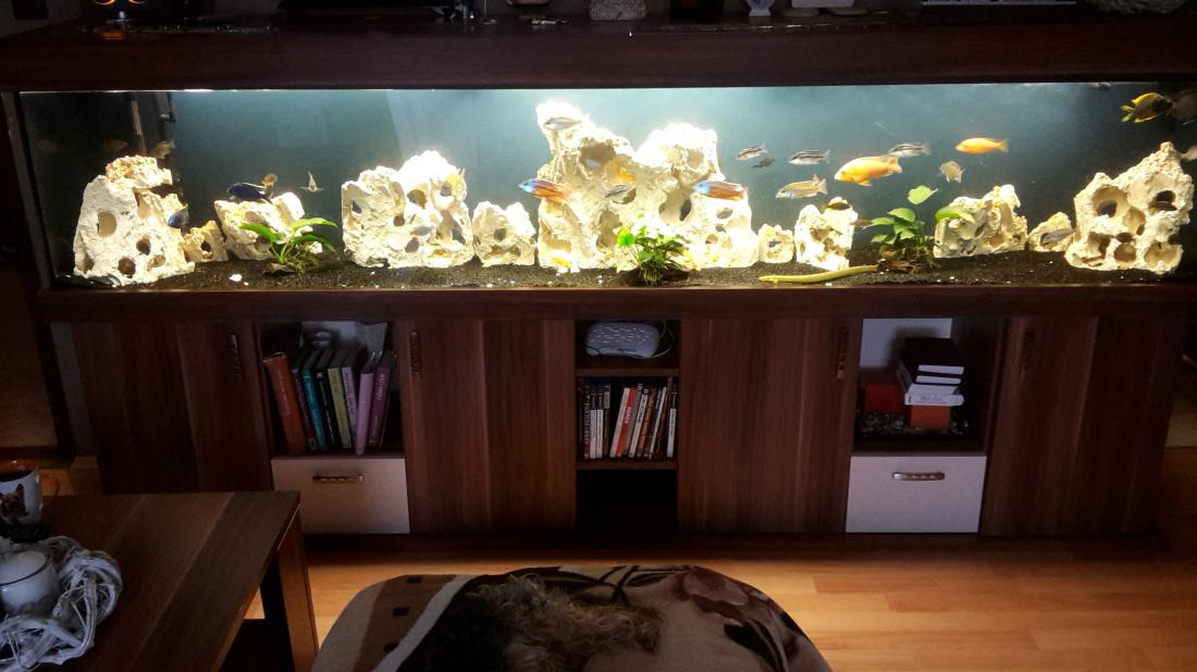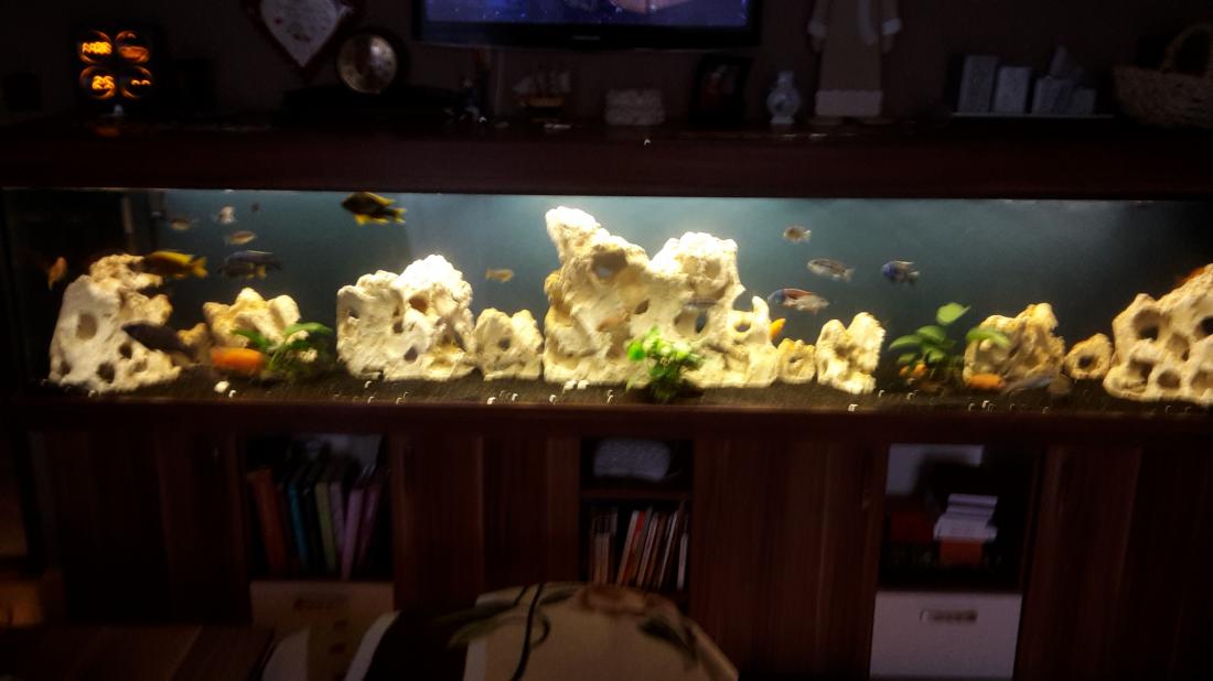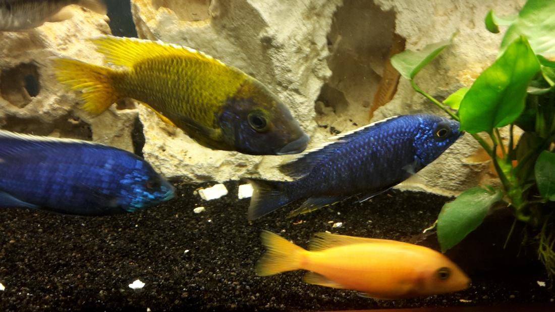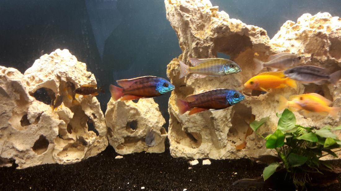 Ryby v nádrži: copadichromis azureus 4/5,protomelas namalenje 2/4,aulonocara fire fish 3/5,letrinops albus kande 3/3,pariky copadichromis borley,aulonocara benga,aulonocara mamelela,sciaenochromis fryeri 5ks,