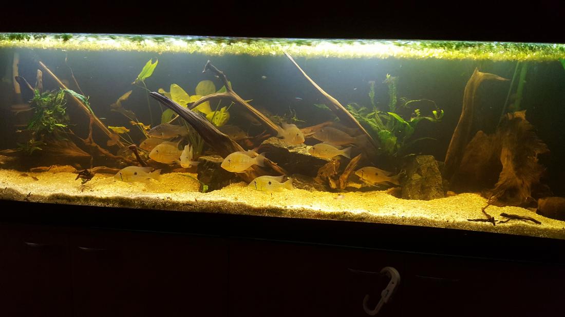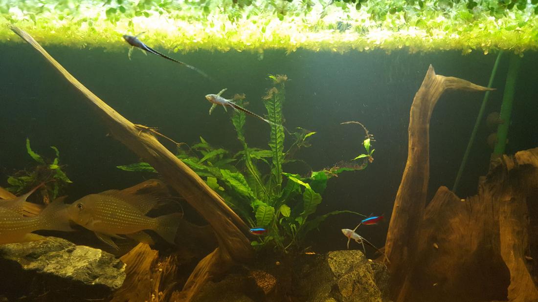 V akva přibyla skupinka Sturisoma aureum a na dno jsem doplnil hejno pancéřníčku Corydoras schwartzi.