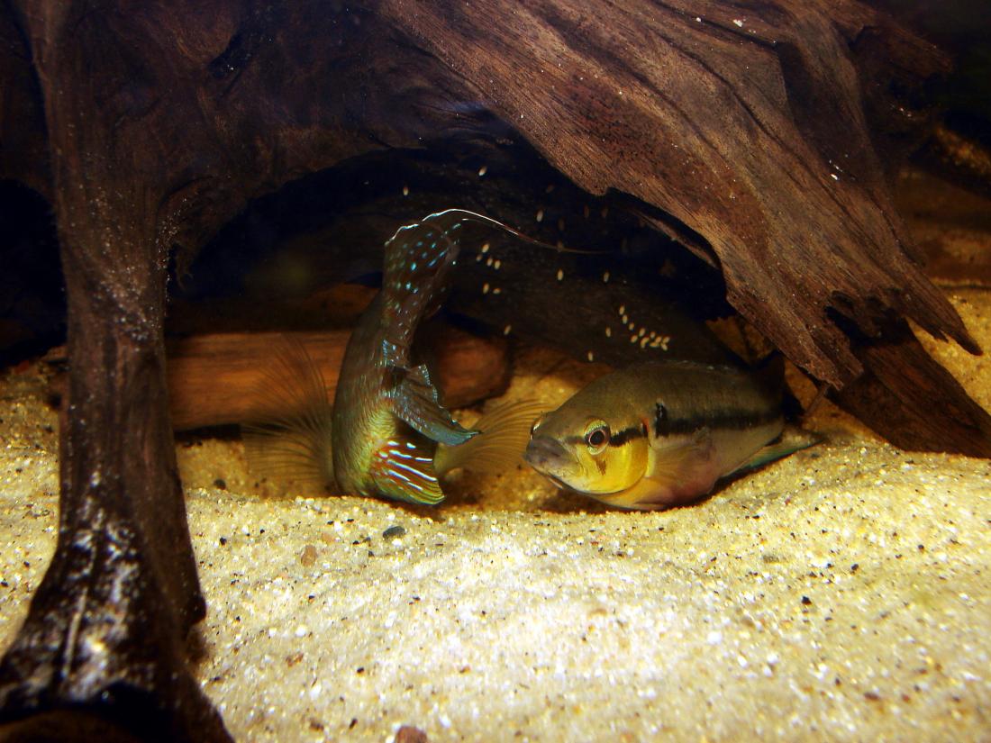 Škoda, že jsem přišel pozdě, jinak bych to celé natočil. Proběhlo to asi tak, že crenicichla nakladla jikry na kořen a on jí oplodňoval talamu :lol: