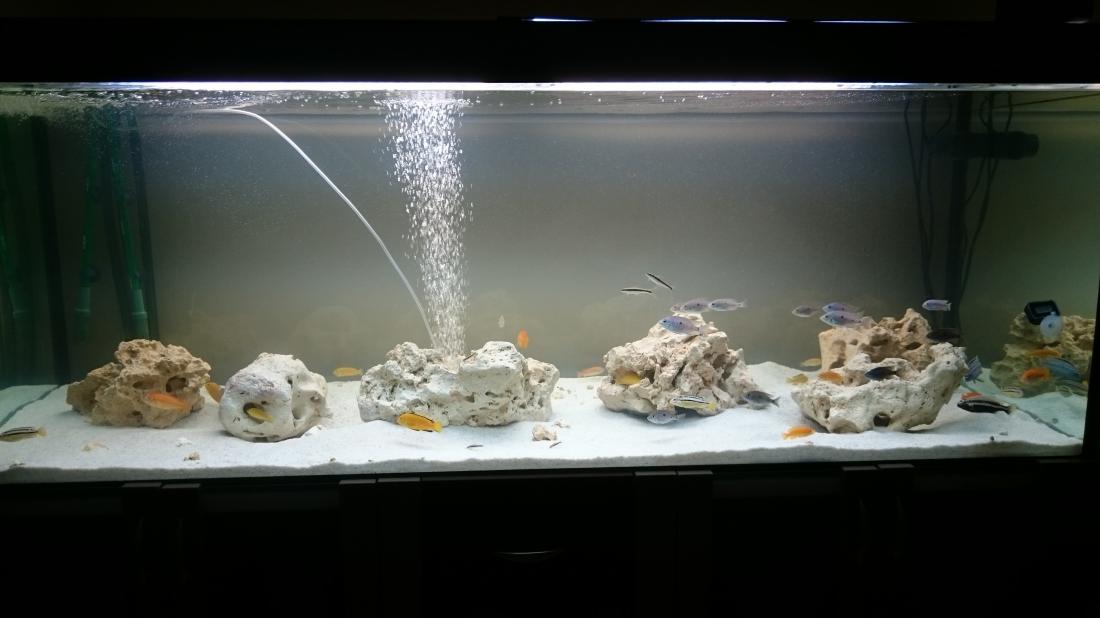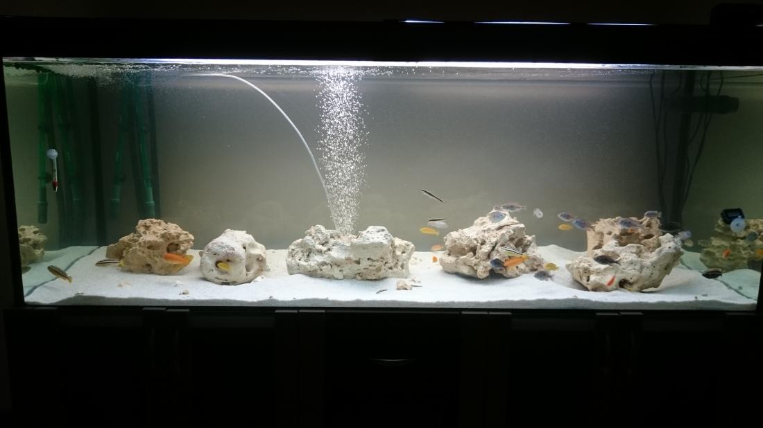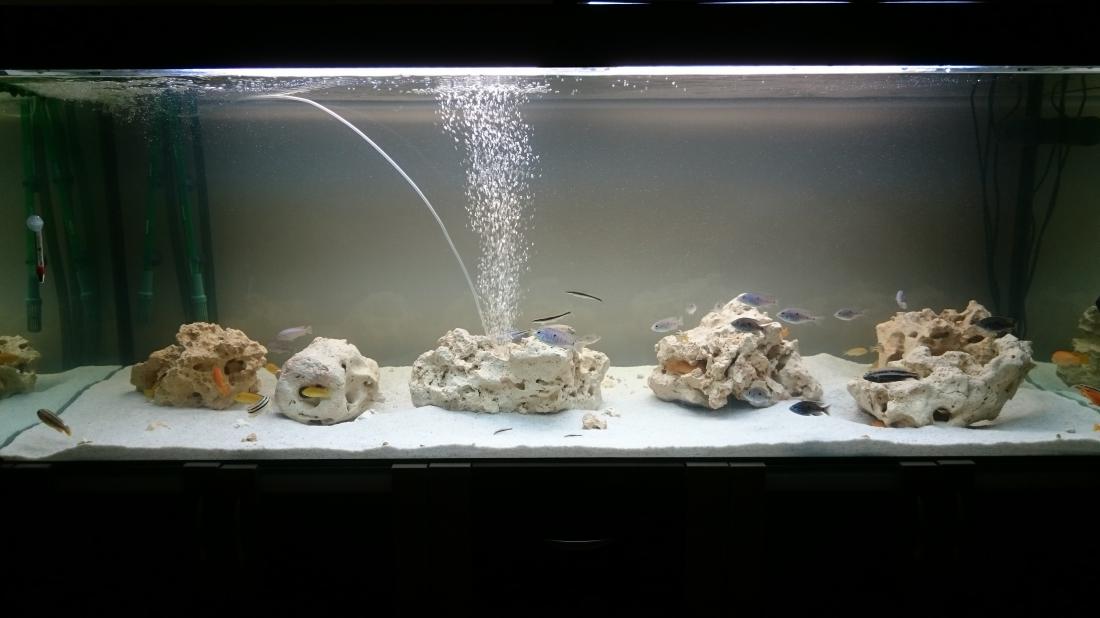 Ja by som osobne vymenil kamene,tieto vápencové dal preč a nahradil nejakými ,,prírodnejšími,, Objem super,osádka tiež.Plánuješ ešte pridať nové ryby alebo toto je finálová osádka?