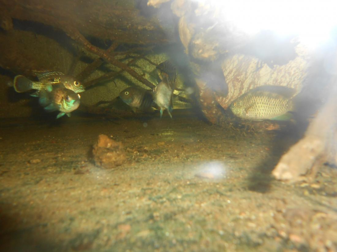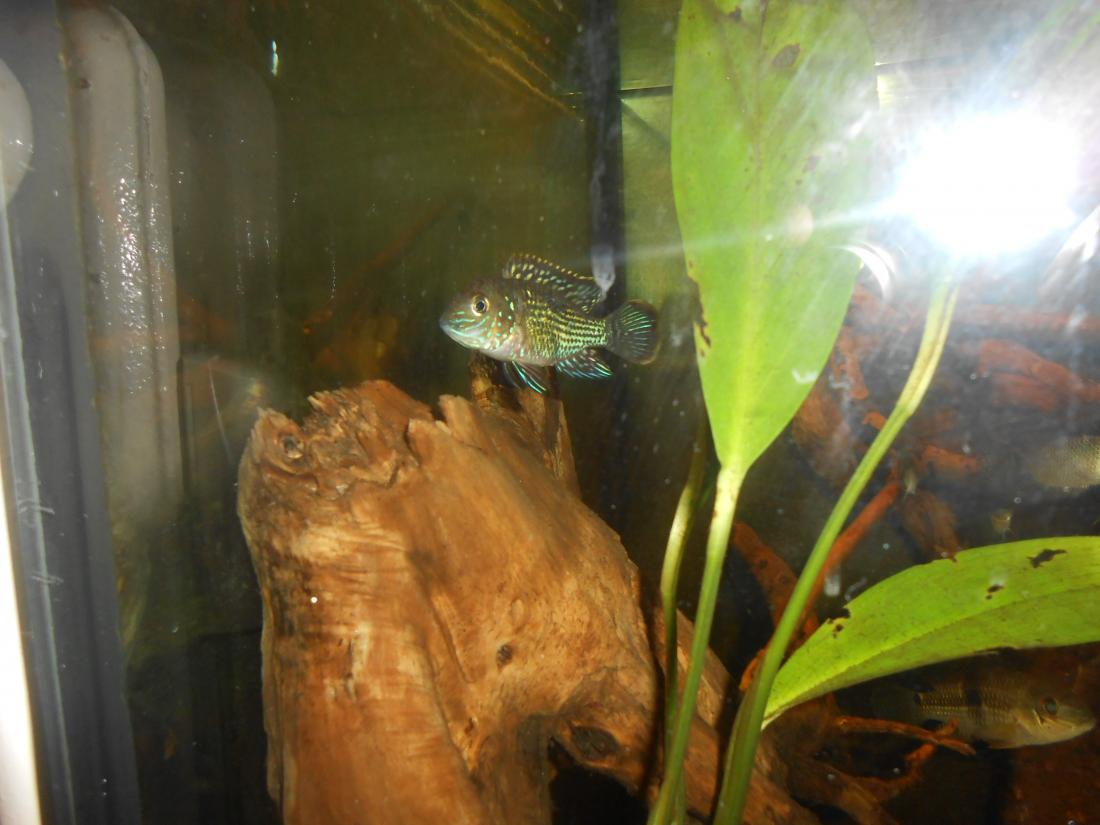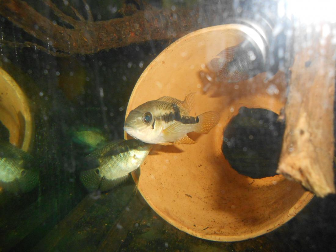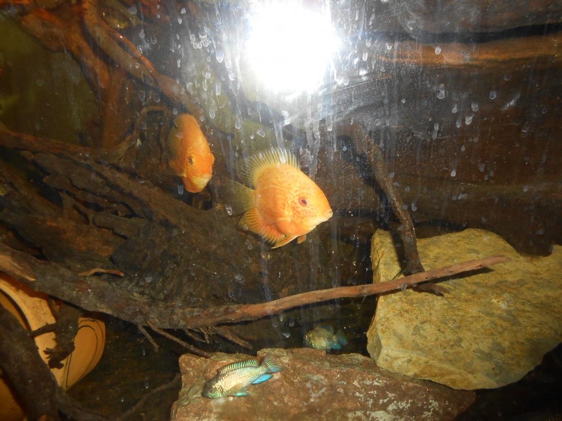 Ryby v nádrži: 2 ks Heros red spotted,1 ks Heros notatus, 4 ks Andinoacara neon blue, 2 ks Andinoacara rivulatus, 2 ks Hypsophrys nicaraguensis, 1 ks Cryptoheros panamensis, 2 ks Cryptoheros sajica, 5 ks Mesonauta festivum
