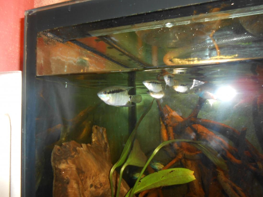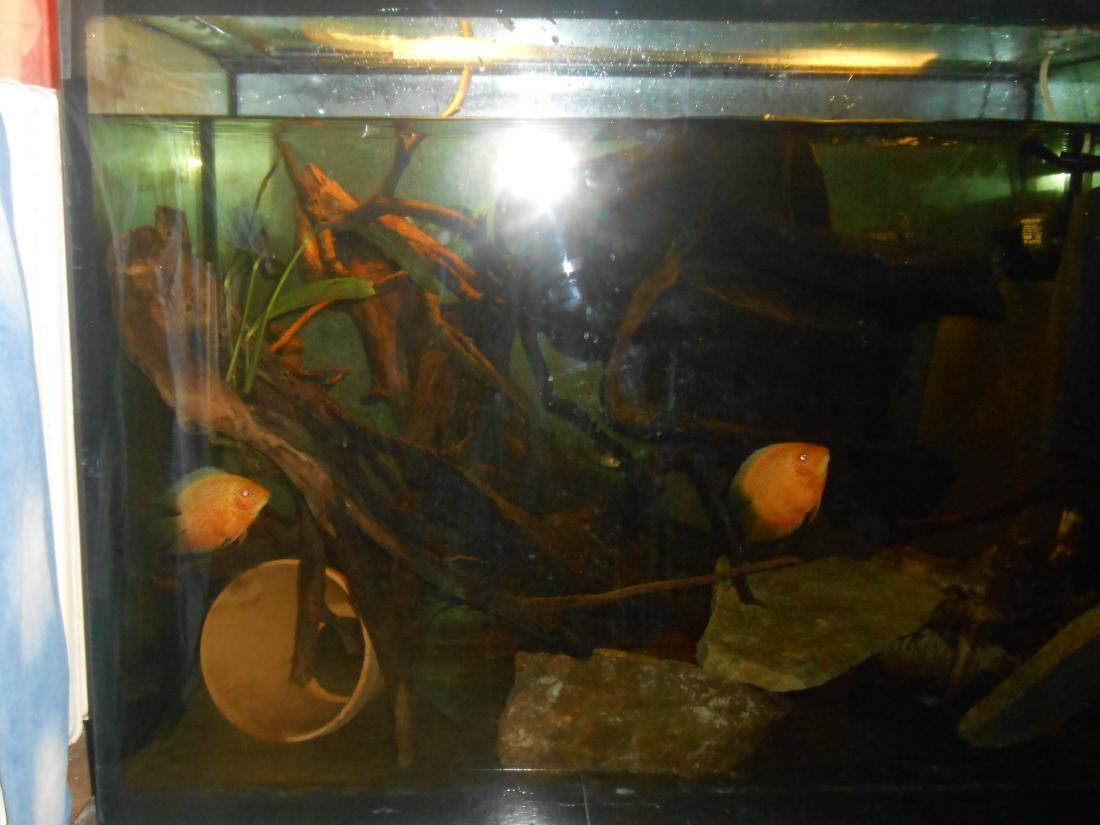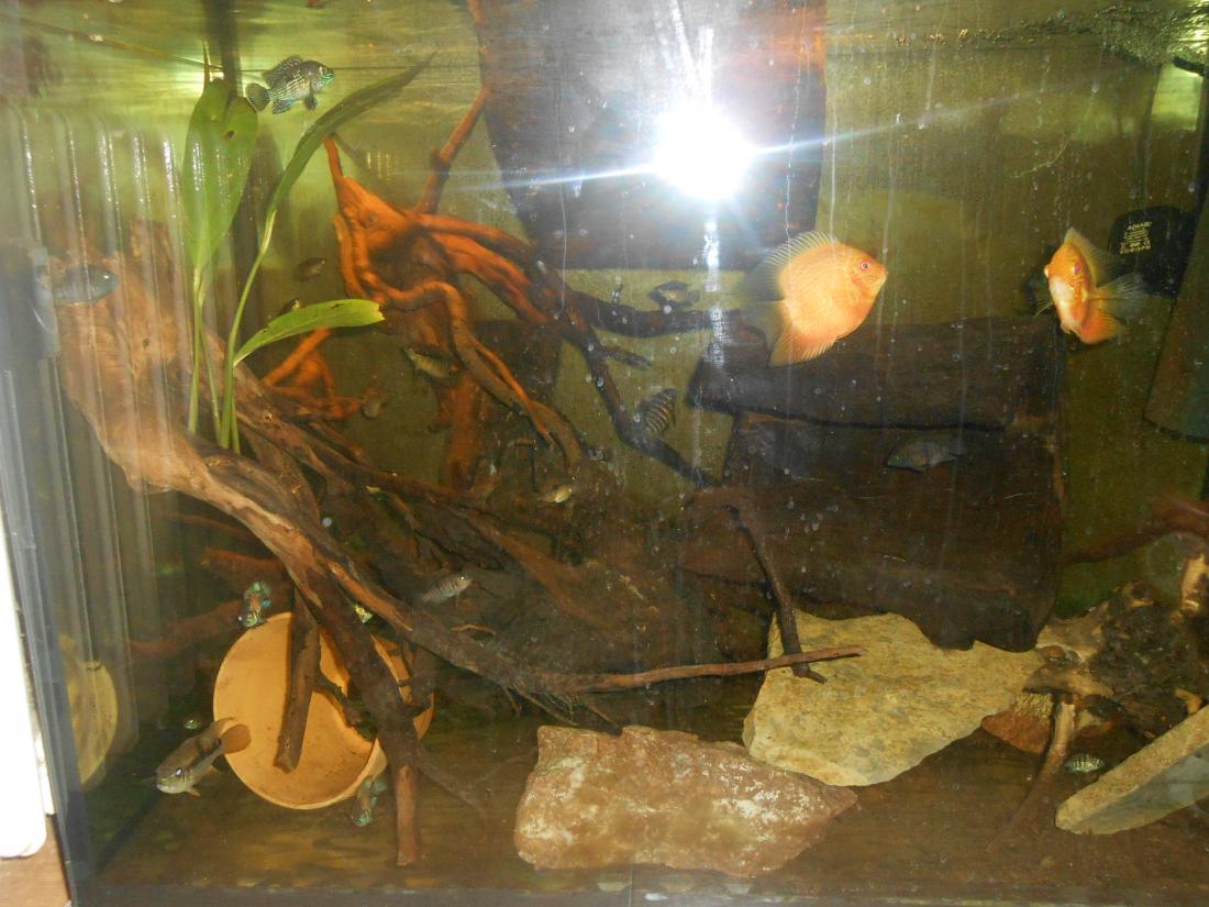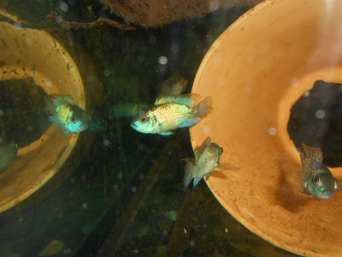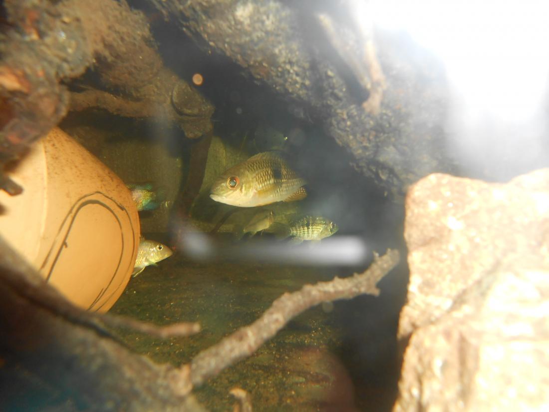 Ryby v nádrži: 2 ks Heros red spotted,1 ks Heros notatus, 4 ks Andinoacara neon blue, 2 ks Andinoacara rivulatus, 2 ks Hypsophrys nicaraguensis, 1 ks Cryptoheros panamensis, 2 ks Cryptoheros sajica, 5 ks Mesonauta festivum