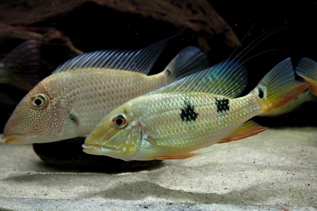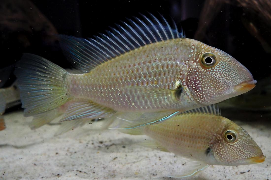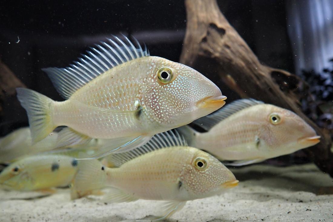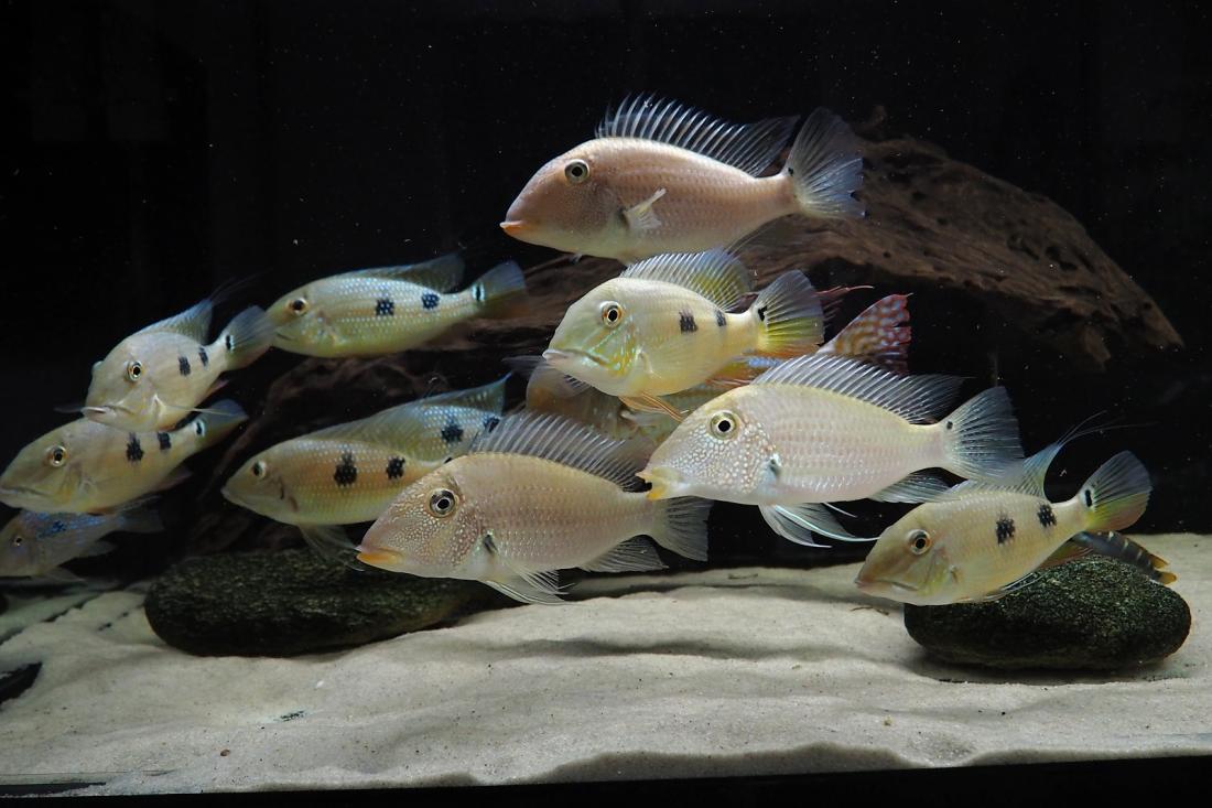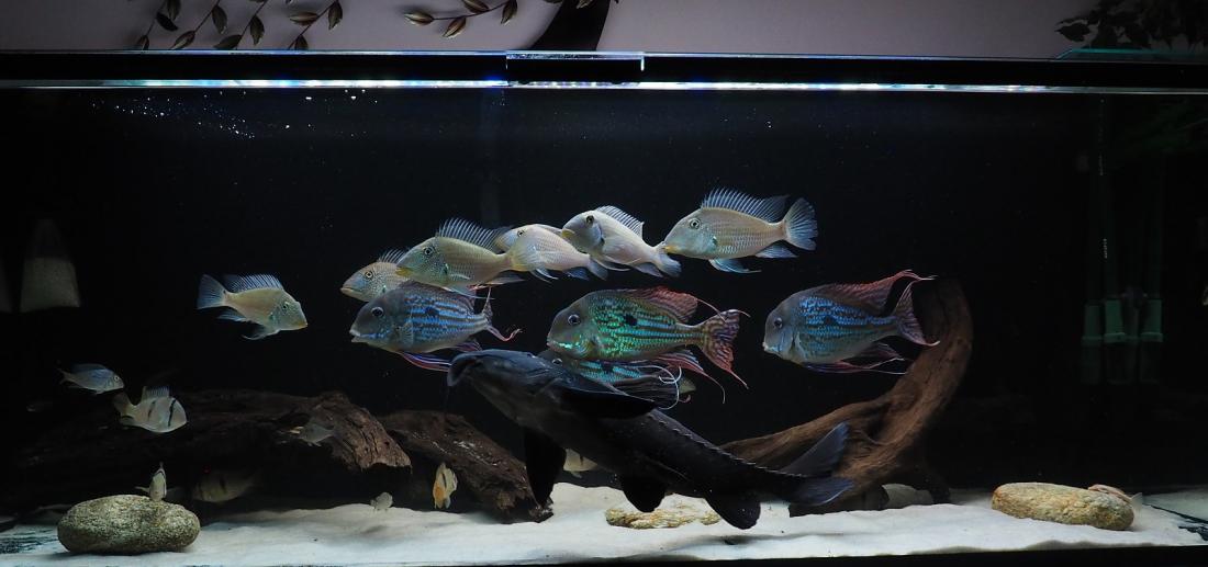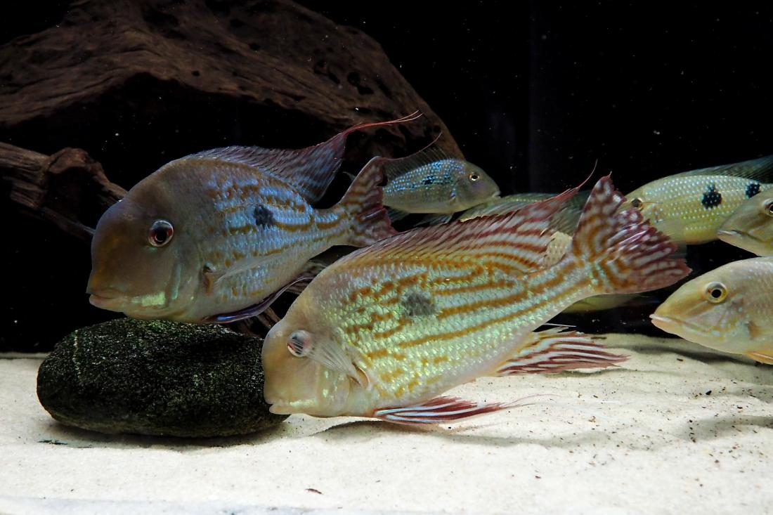 Momentálně mi tam plave 1 pár G. winemillerii, 6ks S. mapiritensis a 7ks S. daemon. Geoši mají tak 28cm, mapiritensky cca 23 a démoni 18-20. Včera se geoši vytřeli a zatím to kupodivu probíhá klidně. 1 pár daemonů už si několikrát vyhrabal v písku díru, kterou několik dní bránil. Tření ani jikry jsem neviděly asi je tam přece jen na ně málo klidu.