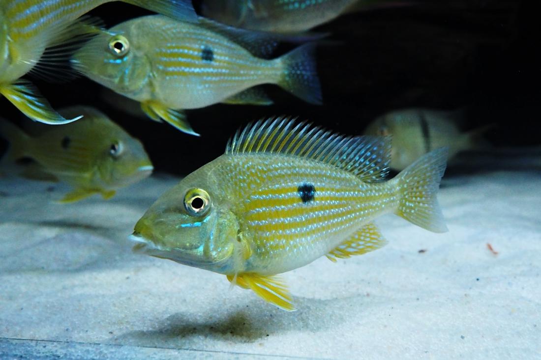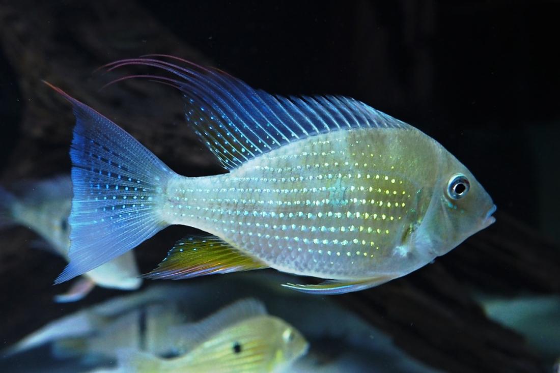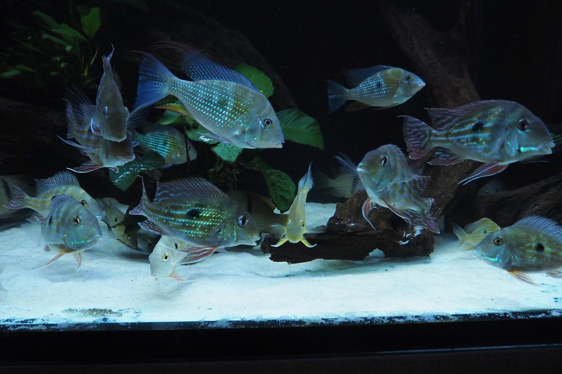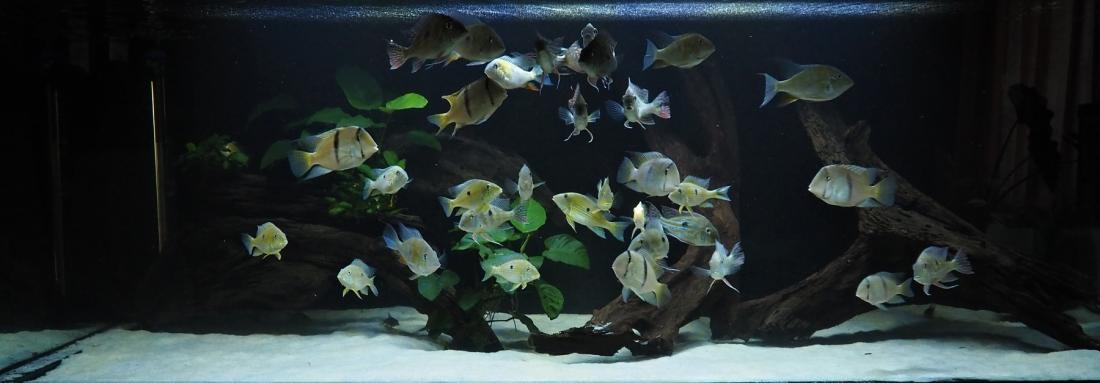 Kytky celkem přežívají na to, že už jsou tam 4 měsíce. Svítím jen večer, nebo když je hodně zataženo, abych viděl na ryby. Až tam dám panaky, které vykrmuju zvlášť, tak bude po nich. Dacrye už mají cca 15cm, nejpomaleji rostou taeniopareiusi.