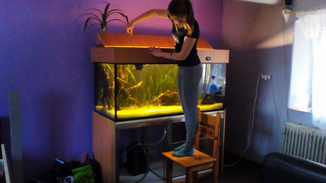 Dnes údržba, vyvětráno o pár litřiků vody, odkaleno a nakrmeno. Pořád je to hrozně prázdný ..