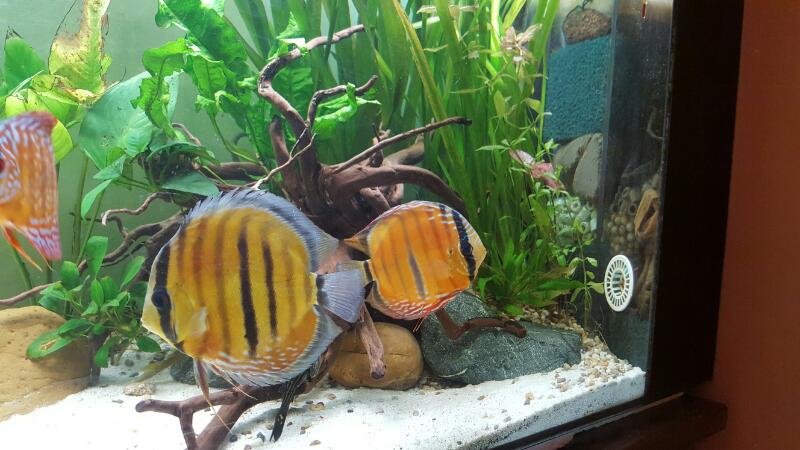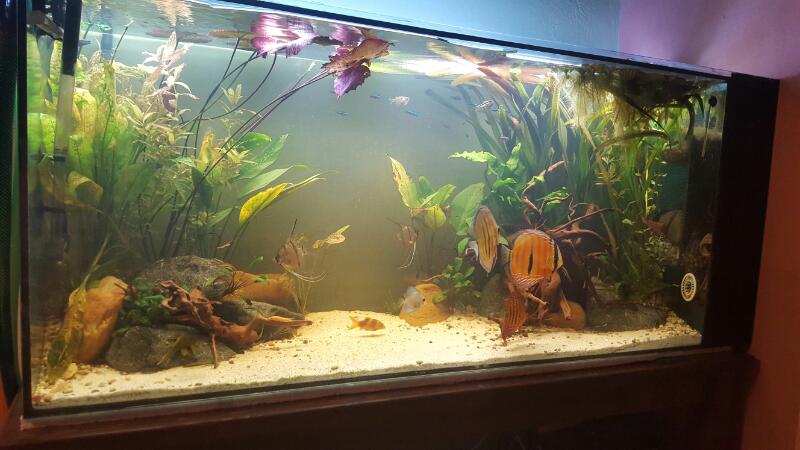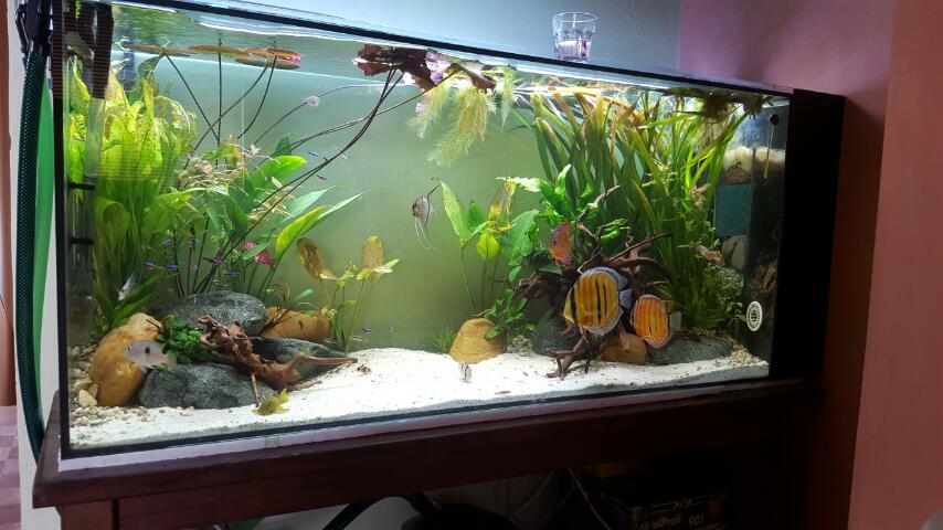 Ryby v nádrži: 2x Pterophyllum scalare Rio Nanay, 1x Discus blue diamond, 1x Discus (bol kupovany ako axelrodi ale asi je to neaky iny) , 1 par Discus - Oriximina red (wild) , 16x paracheirodon axelrodi, 3x Sae, 3x Prisavka thajska, 3x Mrenka krasnoplutva, 5x Mrenka nadherna, 1x guaianacara stergiosa 1x sekierka(na dozitie) a moja druha velka vasen L-sumci - 1x gibbiceps 1x panaque nigrolineatus 1x green phantom pleco 1x golden nuget (L018) 1x Peckoltia vitatta 1x Leopard cactus pleco (L114) , 1x Ancistrus dolichopterus (L183), 1x Peckoltia compta (L134), 1x Snowball pleco (L201) , 1x Loricaria sp. Rio Atabapo. Ak som na niečo zabudol tak doplním časom.