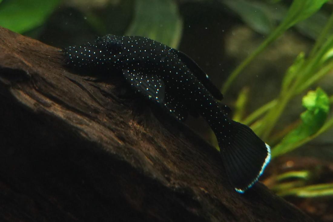 Po více jak týdnu od vpuštění do akvárka se ukázal ancistrus L181. Škoda že tečky a bílý lem ocasní ploutve v dospělosti zmizí.
