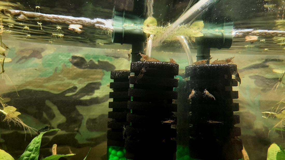 Já občas nějaké krevetky odsaju, nakrmím s nima ryby a krevetky nechám zase dál množit a tak pořád do kola. Na těchto fotkách se to nezdá, ale je jich tam fakt hodně. Jsou poschovávaný po celý nádrži. Když zakrmím u předního skla, nestačím se divit, co jich je.