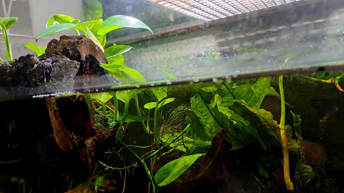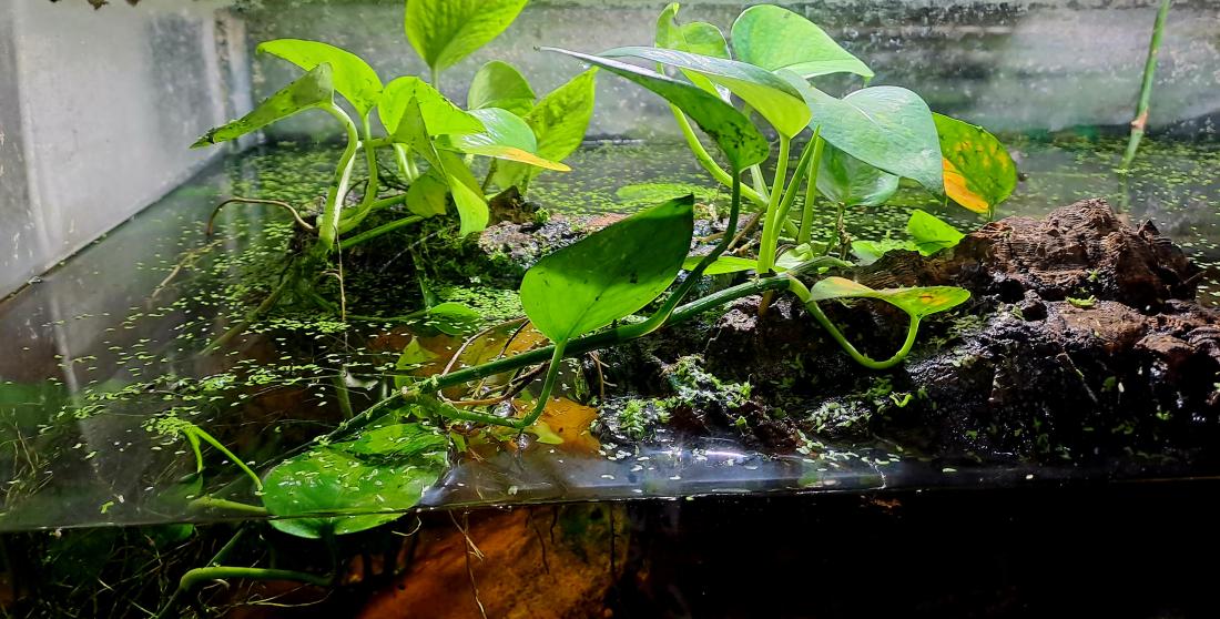 V kanclu jim to skoro chcípá. Naházel jsem ty odstřižené šlahouny na ty plovoucí korkové trubice v nádržích. Z konců co byly pod vodou vyrazili kořeny, teď po roce se to táhne až ke dnu do písku, kořenový systém jako kráva, ke korkovým trubicím to přirostlo a někde i prorostlo skrz. A musím ten sajrajt stříhat každých pár měsíců a vyhazovat! Normálně to roste a vyhání nové listy i pod vodou jako divý![]()