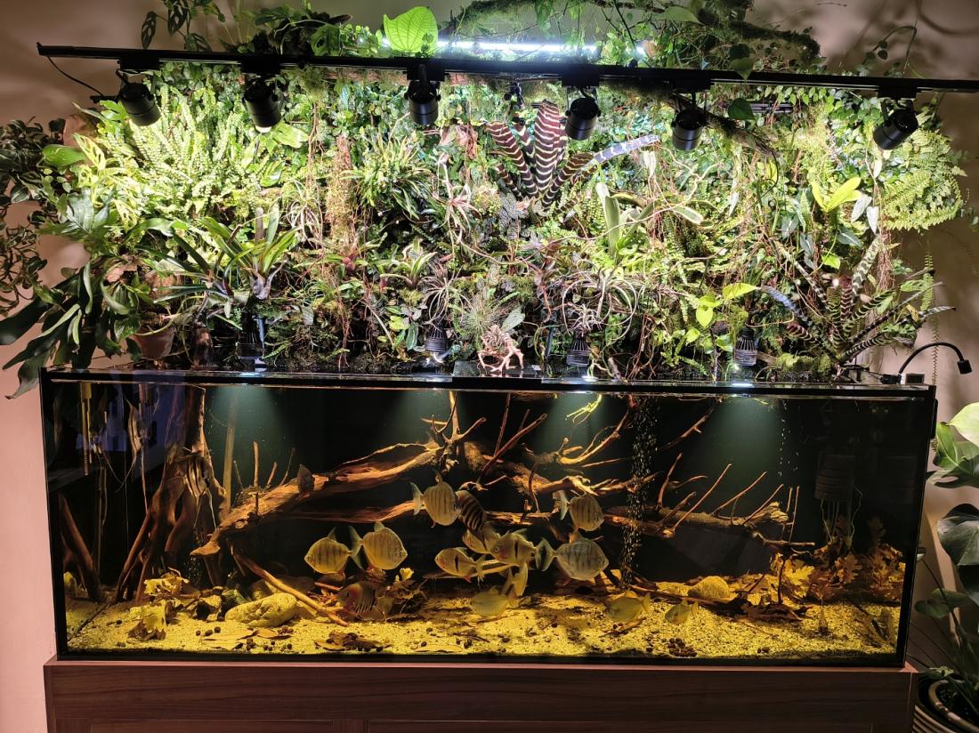 Vypadá to fakt skvěle Mě by se tam líbili ještě nějaký menší, ale ne zase moc malý tetry ve velkém hejnu, které by se drželi blíž k hladině. Máš to super s tou džunglí nad vodou.