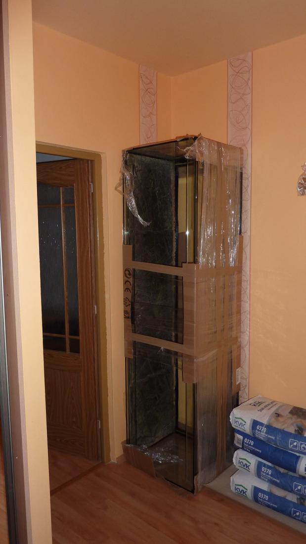 Naivne som si myslel že 2m sa zmestia do výťahu ... no nie, a tak sme to akvárko dvaja, pekne po tesných schodoch trepali na 4 poschodie, resp. 5 nadzemné podlažie .... či ako sa to ráta ... aj stojan ... fuška ... Teraz mi už len zostáva dúfať, že mrazy ktoré boli nedávno nepoškodili lepidlo a nebude tiecť. Skladoval som ho totiž v takej drevenej garáži, len z dosiek, žiadne kúrenie ani izolácia.