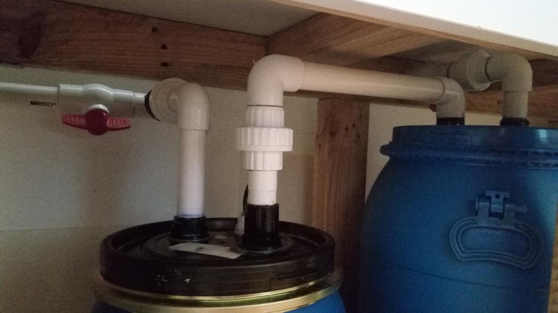 Konečne upgrade filtra spustený. Začína prepadom, odtiaľ voda pokračuje do prvého 45l sudu s molitánom, z tade do 24l sudu s iontomenicom Pure PA202 (5l) a z neho vodu tlačí Jebao dcs5000 do nádrže :twisted: