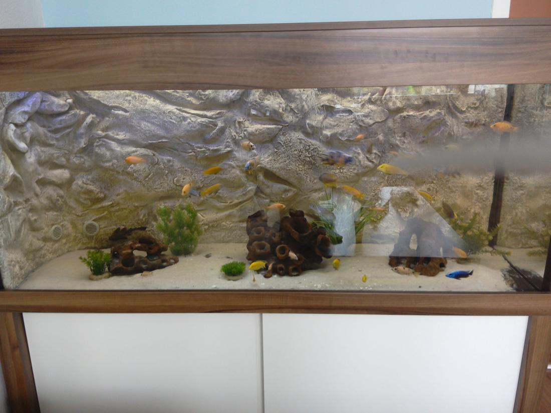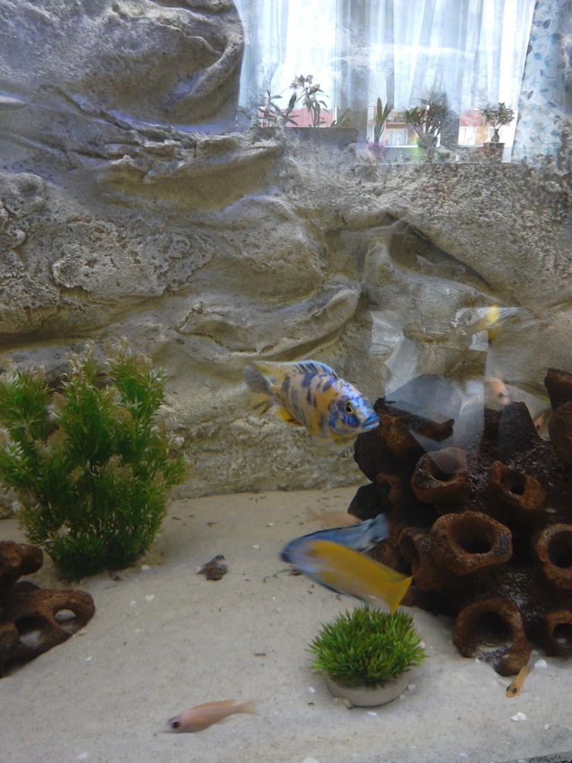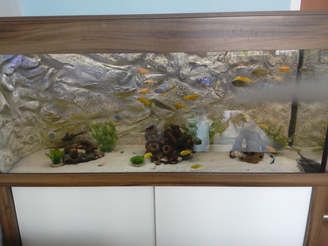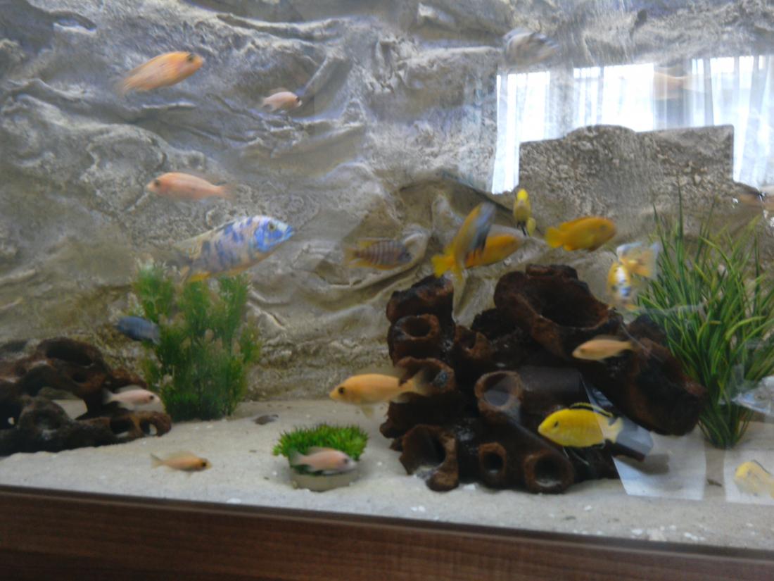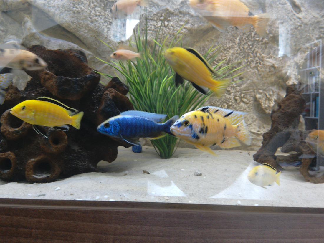 Ryby v nádrži: 8 ks aulonocara calico, 6 ks Labidochromis Caeruelus Yellow, 8 ks Aulonocara Fire Fish , 4 ks Aulonocara sp. Red Rubín, 3 ks Sciaenochromis Fryeri Ice Berg , 5 ks Pseudotropeus saulosi a 2 ks Ancistrus.